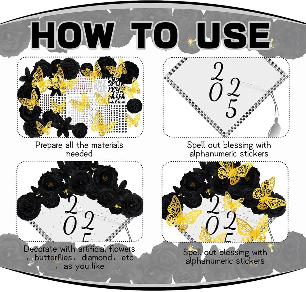 Enjoy DIY: You can use letter stickers and rhinestone stickers to spell out names or blessings on the graduation cap, and then use hot glue ( not included) to attach the flowers and butterflies, and you will finally get a unique and exclusive graduation cap