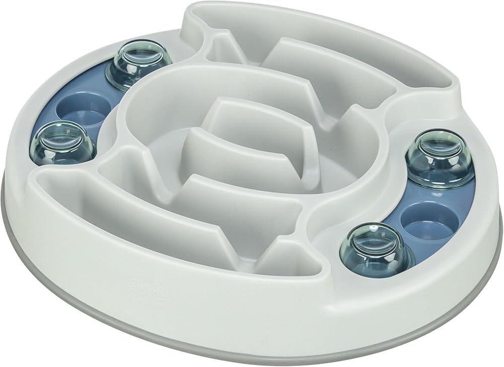 TRIXIE Dog Activity Slide & Feed interactive dog puzzle toy provides fun and mental stimulation. It features a slow feeder bowl and six treat-hiding compartments that can be filled with your pet's favorite treats and kibble. Your dog will get excited about puzzles! The non-slip rubber feet keep the game in place as your dog plays and explores. We've included an instructional booklet with tips and tricks for challenging and training dogs of all ages through play. Suitable for dogs of all ages and activity levels. Made from tough plastic parts and pet-safe materials that are BPA and Lead-free. Dishwasher safe or hand wash with soap and warm water to clean between uses. Your pet should be supervised with this toy.