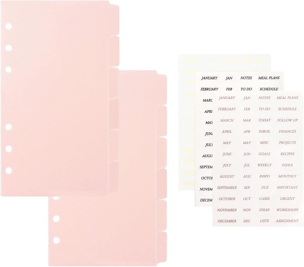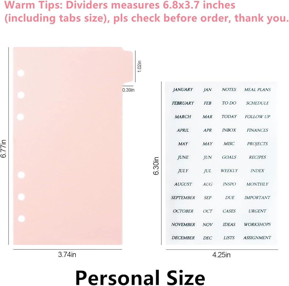 The size of binder divider is 6.8 x 3.7 inches (including tabs), thickness is 0.16" (4mm), hole diameter 0.2" (5mm); Package: 6 sheets of clear a6 binder dividers, 3 sheets of monthly stickers.