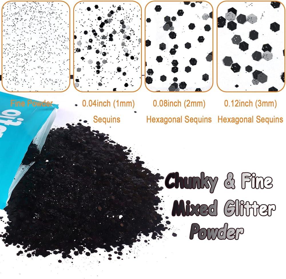 ✅Safe Material - Chunky glitter extra fine dust flake is safe, no smell, biodegradable, and will not melt and fade with time. Black glitter can be used with adults and children to add luster to life.