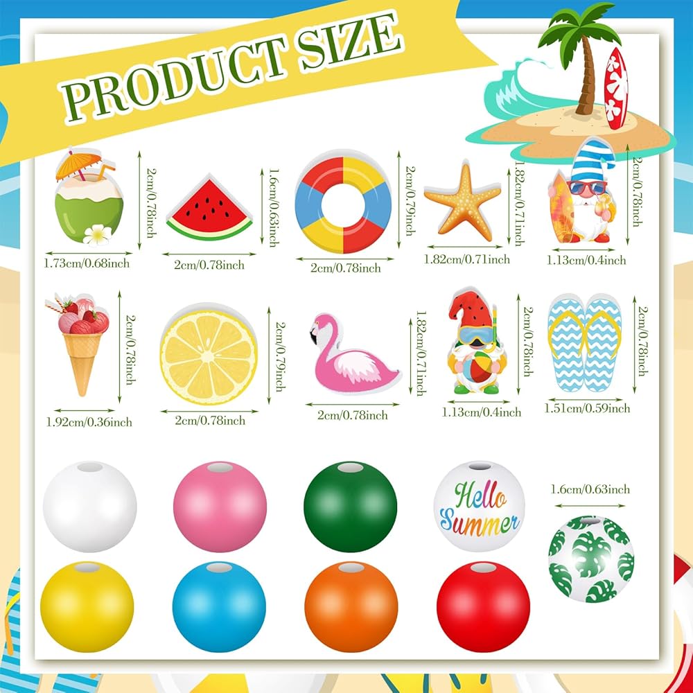 • Package List: you can get 200 Hawaii theme beads in 18 styles, 50 pieces flat wooden beads in 10 styles, 5 pieces for each style, each measures about 0.79 inch/ 2 cm in diameter, 12 pieces of round beads in 2 styles, 6 pieces for each style, each measures about 0.63 inch/ 1.6 cm in diameter, 138 pieces solid color wood beads in 7 colors, 20 for white, 20 for green, 20 for blue, 20 for pink, 20 for red, 20 for orange and 18 for yellow, each measures about 0.63 inch/ 1.6 cm in diameter