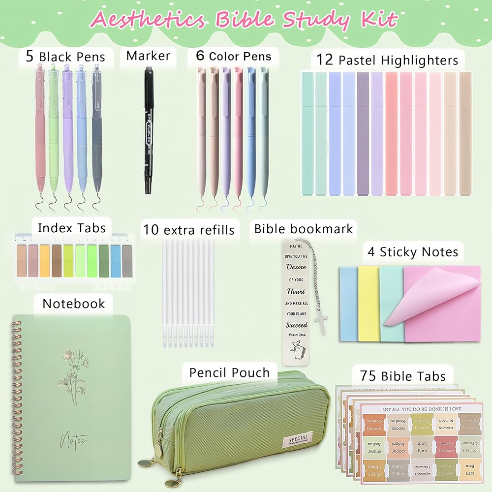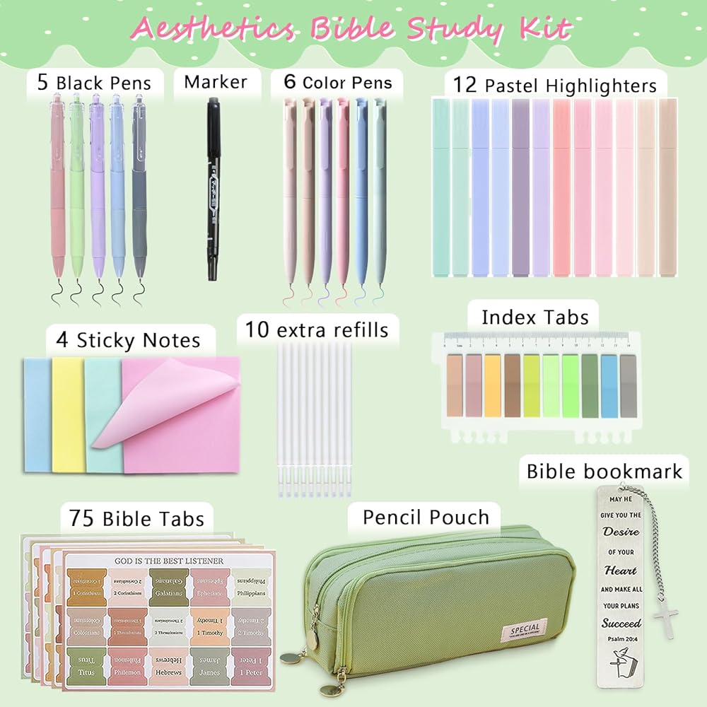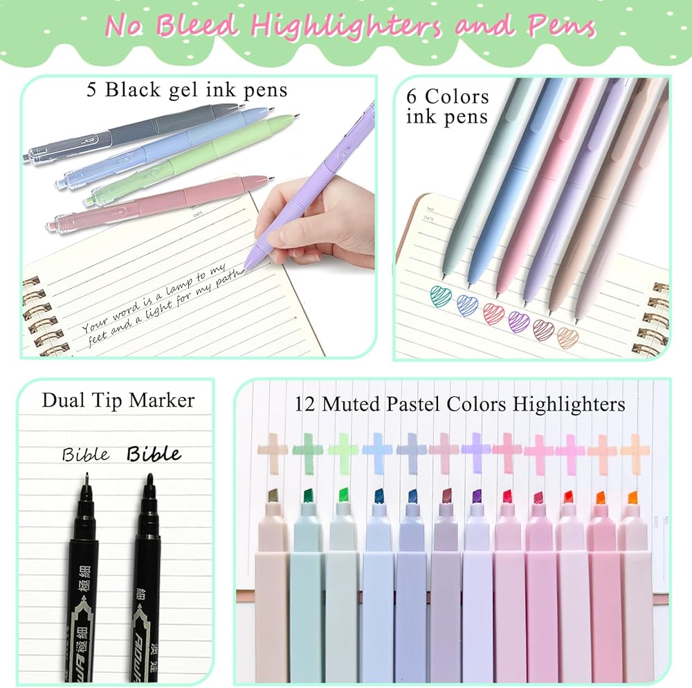 Elevate your Bible study experience with the Shinyharbor Bible Journaling Kit, the ultimate all-in-one solution for women seeking to deepen their faith and creativity. This comprehensive set includes 66 Bible Tabs, 12 non-bleeding Highlighters, 5 black gel pens with 10 extra refills, 6 multi-color pens, frosted sticky notes(can be written by all kinds of pens), and a stainless steel Bible bookmark, all neatly organized in a stylish pen case. The A5 spiral notebook features high-quality 100g paper, perfect for jotting down notes, prayers, and reflections. With our well-organized study tools, including index tabs and sticky notes, you can easily navigate scriptures and personalize your Bible. This kit is not just about study supplies; it's a creative outlet for highlighting key verses and decorating your pages. Ideal for Bible journaling, study groups, or as a thoughtful gift for Christian women, this Bible study kit is a must-have for anyone looking to enrich their spiritual journey. Whether you're using it for personal reflection or as part of a Bible study for women, the Shinyharbor Bible Journaling Kit is the perfect companion for your faith exploration.