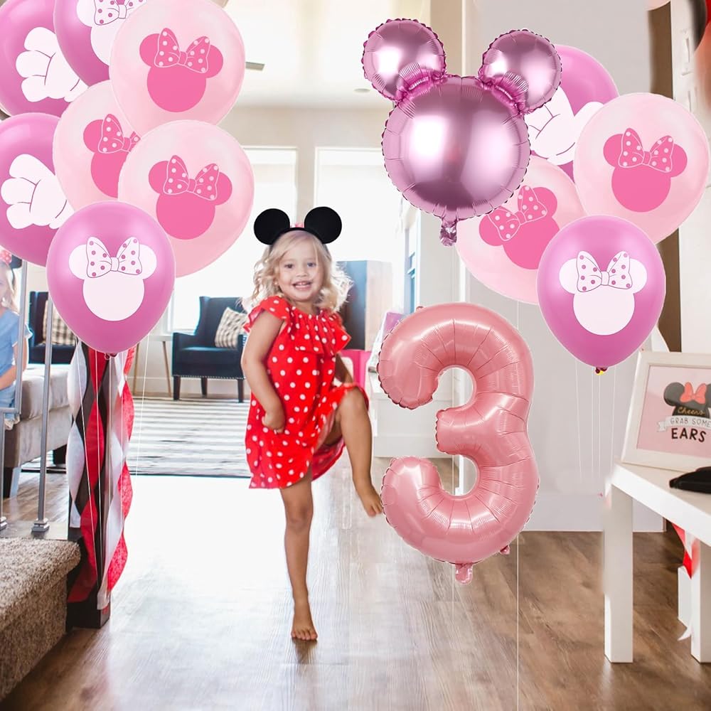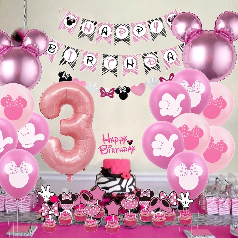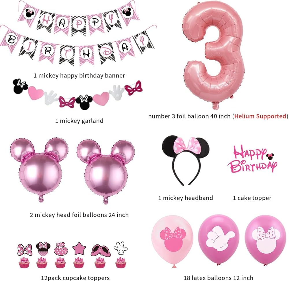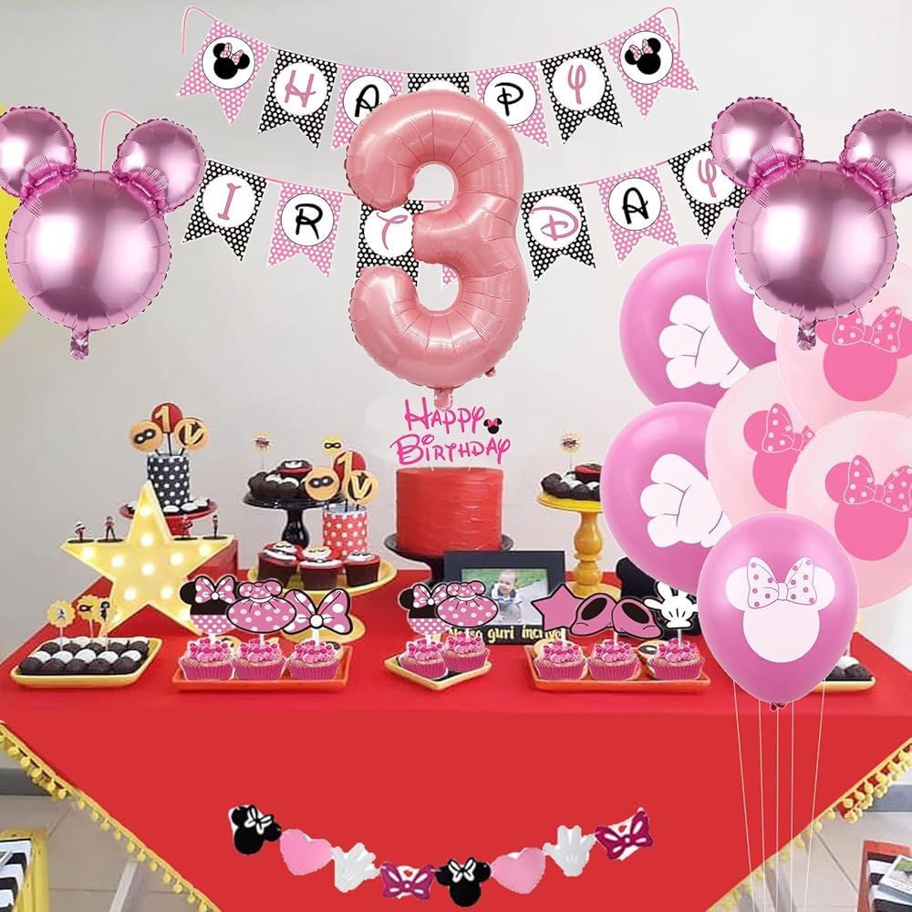 【Minnie Third Party Supplies】: Perfect birthday party must be includes 1 happy birthday banner, 1 garland, 1 cake topper, 12 cupcake toppers, 18 latex balloons 12 inch(3 different patterns), pink number 3 foil balloon 40 inch, 2 minnie head foil balloons 24 inch, 1 minnie headband.