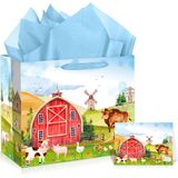 Suitable Size: The size of the barnyard first birthday gift bag for boys is 11.8 x 9.4 x 5.3 inches, which is big enough to store drinks, farm animal gifts, chocolate, candies, cakes, etc. The blue farm animal tissue paper measures 19.7 x 27.6 inches, which can wrap most bagged items, and the farm animal 1st birthday card measures 4.72 x 7.09 inches