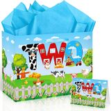 Innovoscape Farm Animals 1st Birthday Decorations Farmhouse Barnyard First Birthday Gift Bag with Tissue Papers Card One Bday Wrapping Paper Bag for Kids Newborn 1st Bday Baby Shower Christmas Party
