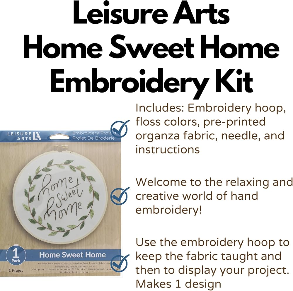 LEISURE ARTS Embroidery Kit 6" Home Sweet Home - Embroidery Kit for Beginners and Adults, Cross Stitch Kits with Patterns, DIY Starter Set for Seasonal Craft Projects