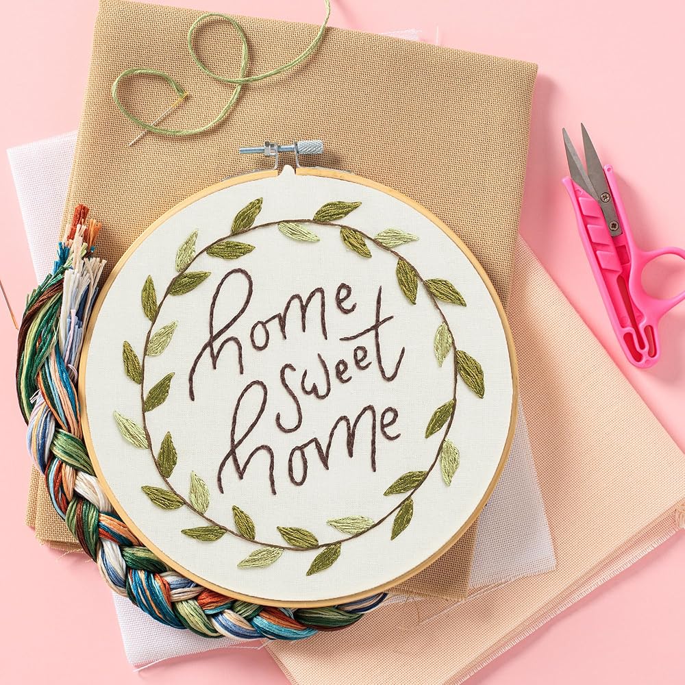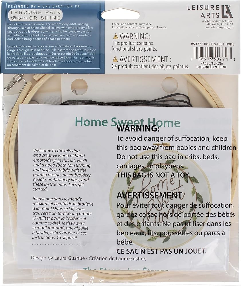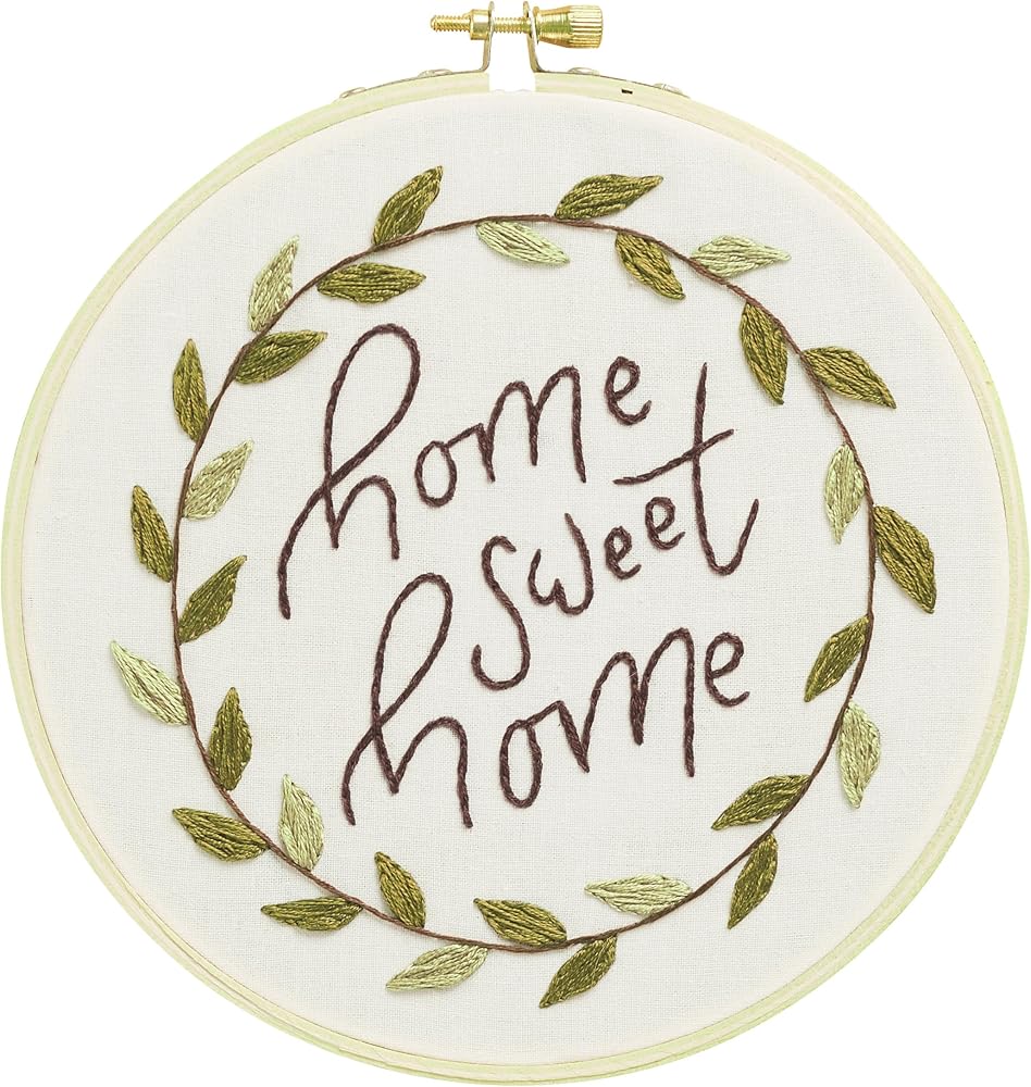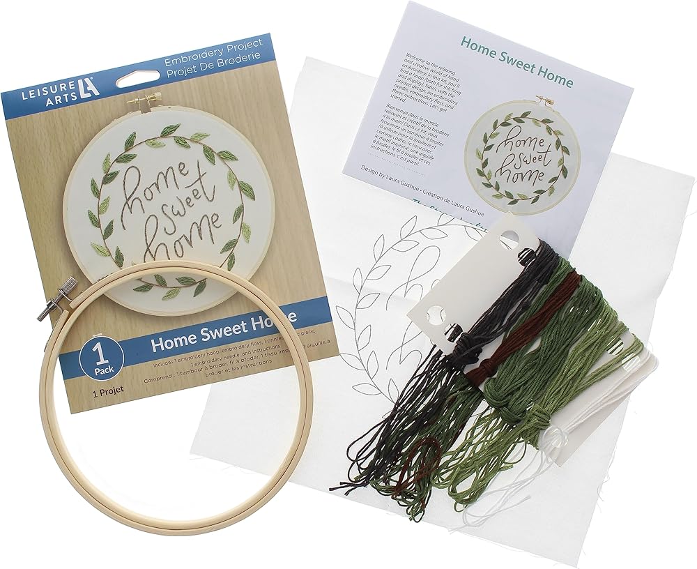 Leisure Arts Kit Embroidery 6" Home Sweet Home- Printed embroidery design for easy completion. Can be completed and used as a wall decoration for your living room, bedroom, office and anywhere else you want a little flowery cheer. It can be a beautiful present for your wife, kids or friends to wish them happy birthday. This embroidery kit with pattern and instructions is suitable for any skill level, even beginners. Pre-printed fabric and instructions make it perfect for anyone to learn embroidery. Easy for beginners, adults or kids and printed patterns easy to follow. Also great for teaching embroidery and the steps and stitches to complete a project. What's more exciting than passing on and sharing your craft with others? Includes 6" wooden embroidery hoop, embroidery floss, printed organza fabric, embroidery needle and full-color, step-by-step instructions. Use the embroidery hoop to keep the fabric taught and then to display your project. Makes one design. Colors and contents may vary.