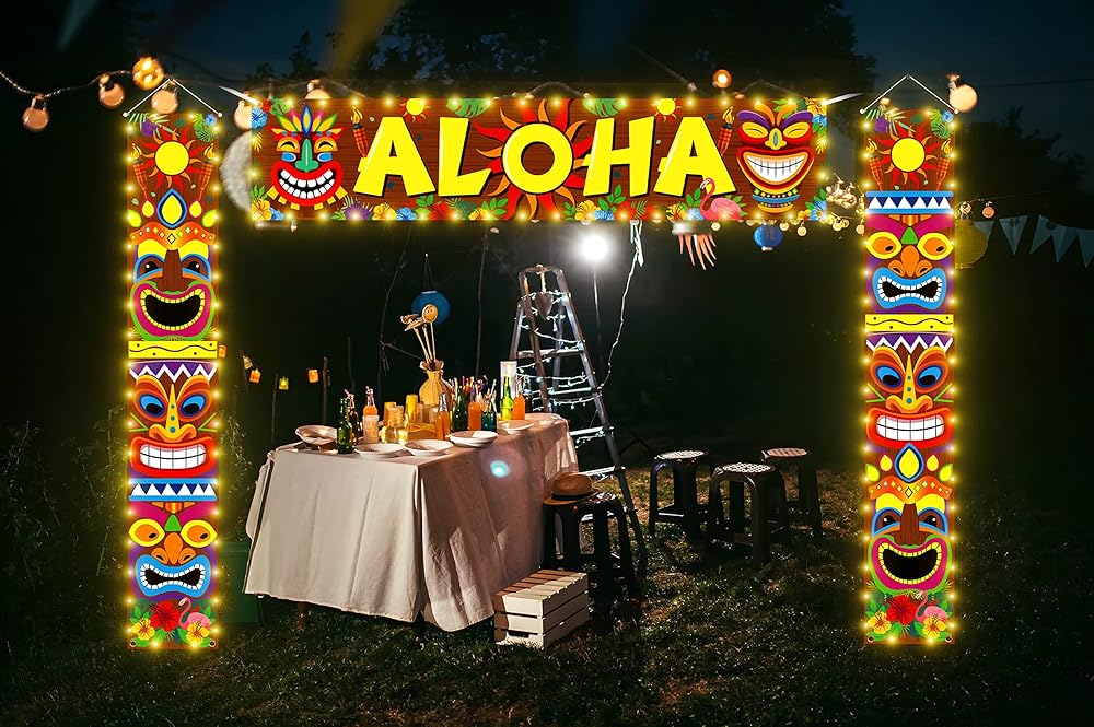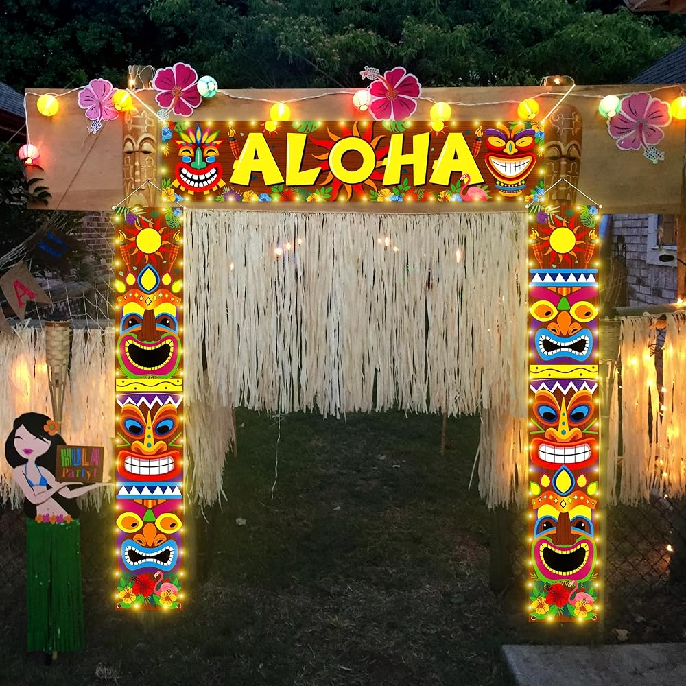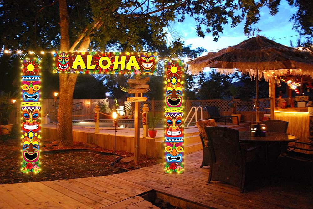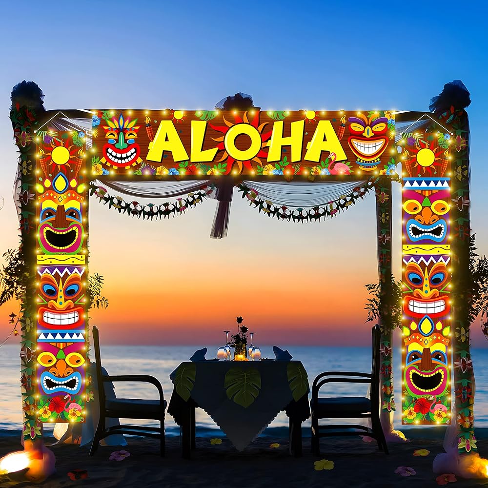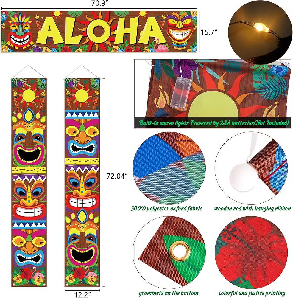 Measurements: "Aloha" banner measures 70.9" x 15.7"; two Luau decoration tiki banners measure approximately 12.2” x 72.04”; ribbon is approximately 16.4” long