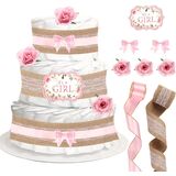 What You Will Get: You'll receive 2 rolls of pink ribbon, 2 rolls of gray ribbon, 2 double-sided printing card-stock cutout toppers, 2 double-deck pink bow tie, 2 pink artificial flowers, sufficient quantity to ensure you decorate the diaper cake(Diaper not included).
