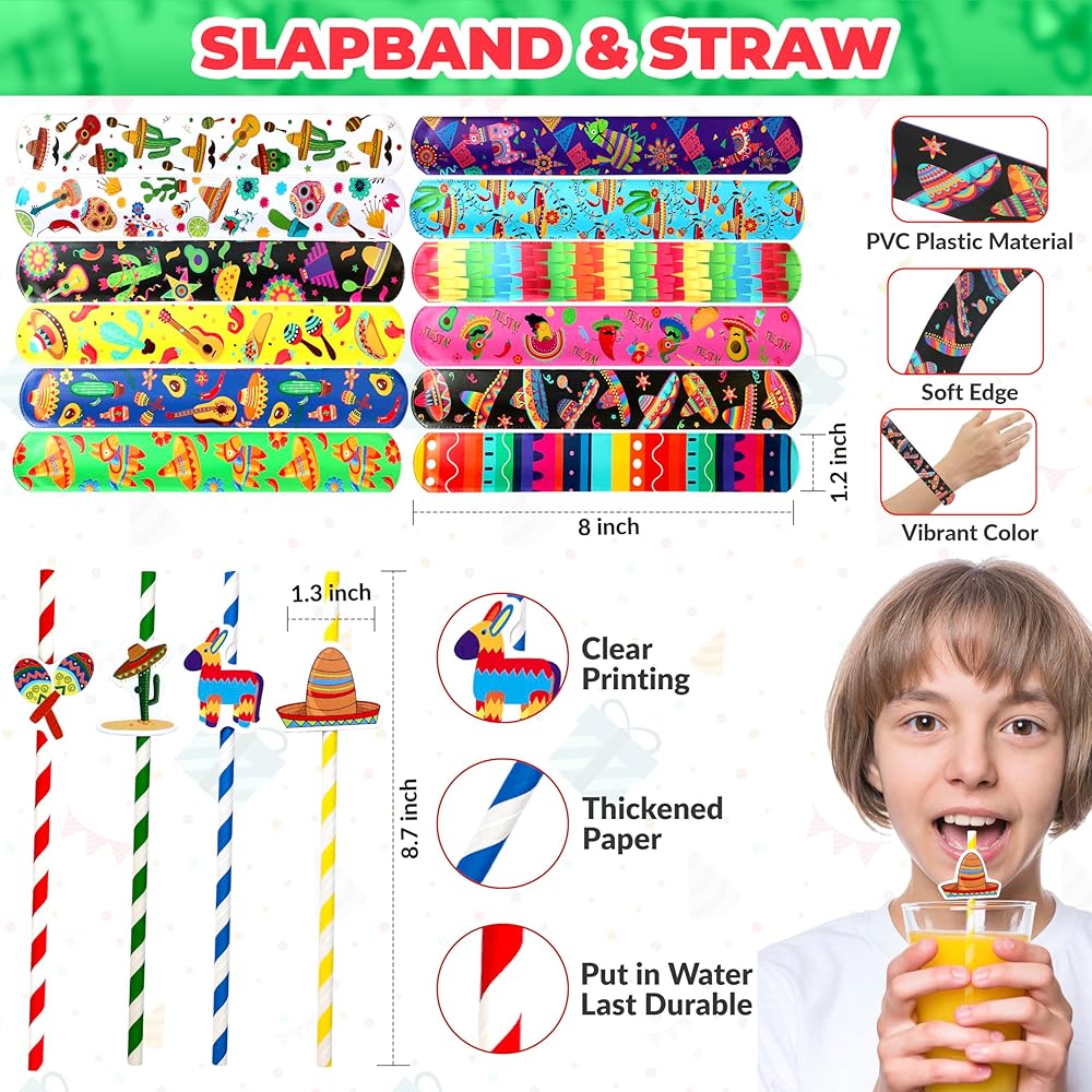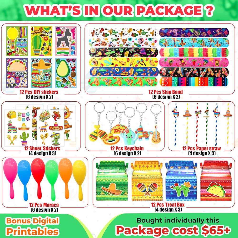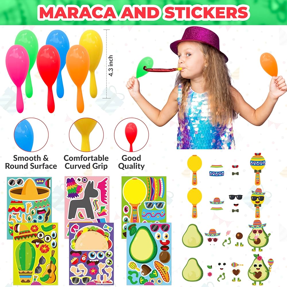 Our 84 Pcs Mexican Fiesta Party favor bundle will help you to add a big smash to a perfect Cinco de Mayo Celebration! Fiesta Theme Straw, DIY Stickers, Mini Maracas, keychain, wristband are great joy for kids for fun and enjoy party.