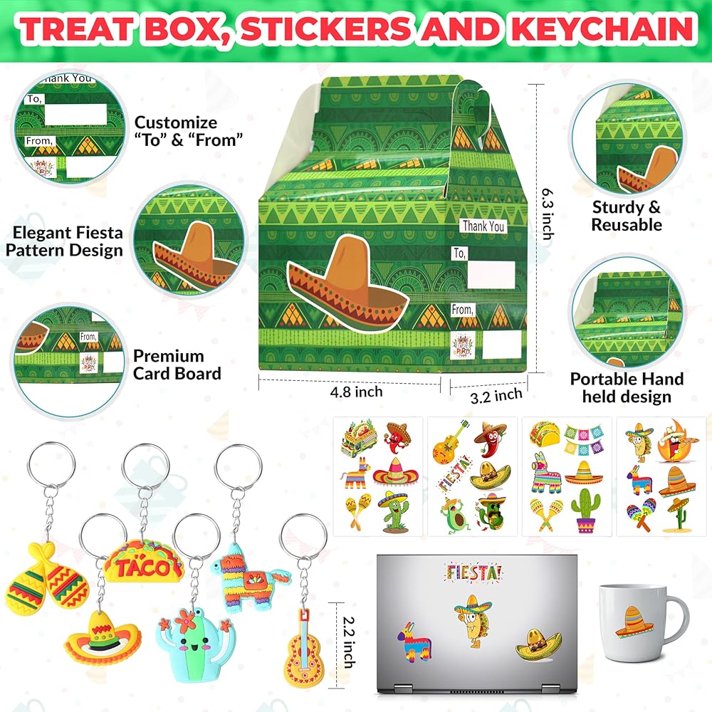 This party favors are designed with various styles of classic fiesta elements, such as taco, cactus, guitar, sombrero, pinata, aocadov, maraca and so on, brightly colored, which full of strong fiesta vibe and creating a vivid atmosphere to your party!