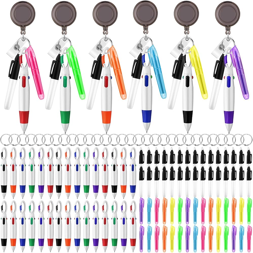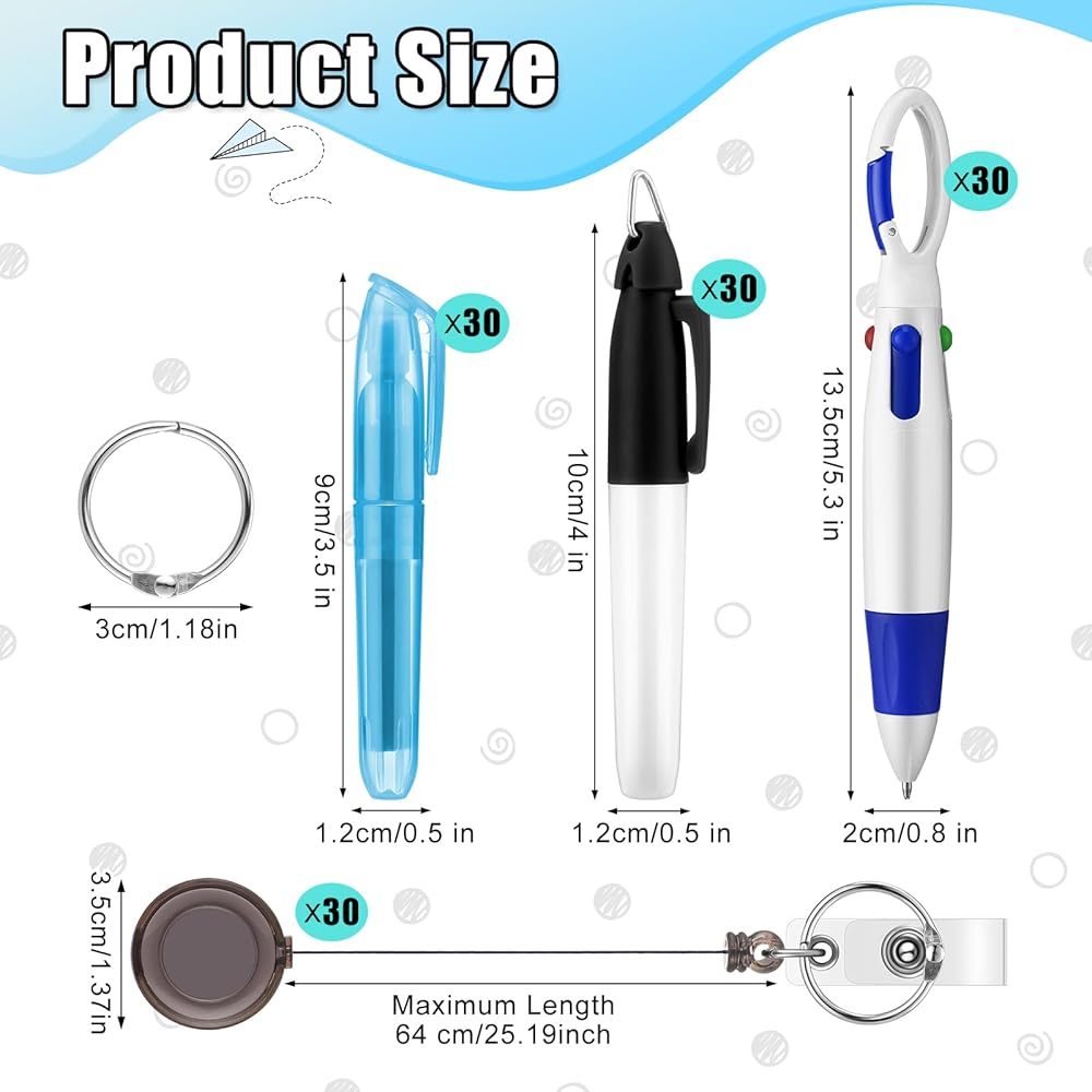 • Good Combinations: you will receive 30 pieces of retractable badge reels clips with 30 pieces of metal key rings, 30 pieces of permanent marker pens, 30 piece of retractable 4 in 1 ballpoint pens, 30 pieces of mini highlighters, good combinations and enough quantity to meet your needs and replacements; Note: you need to assemble by yourself