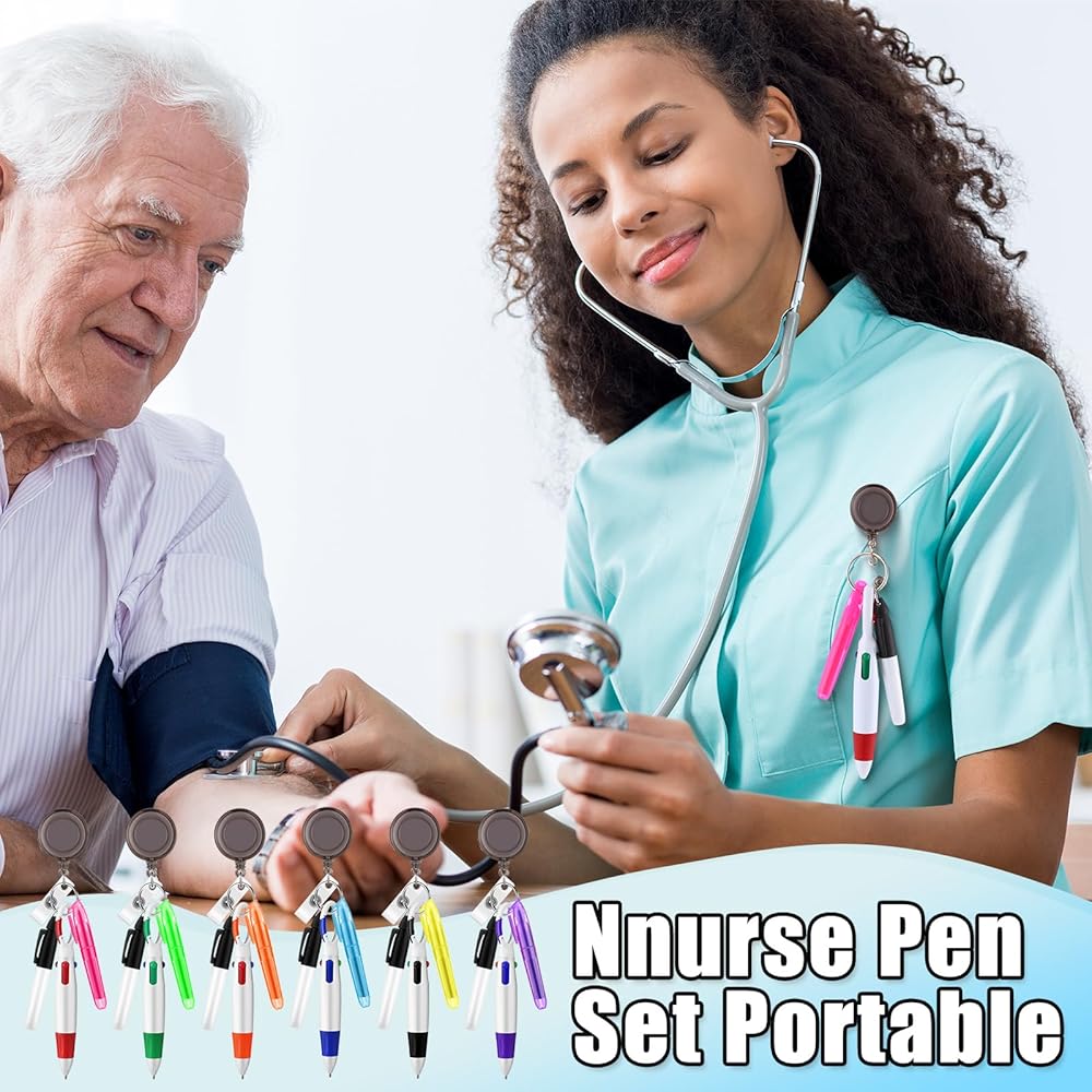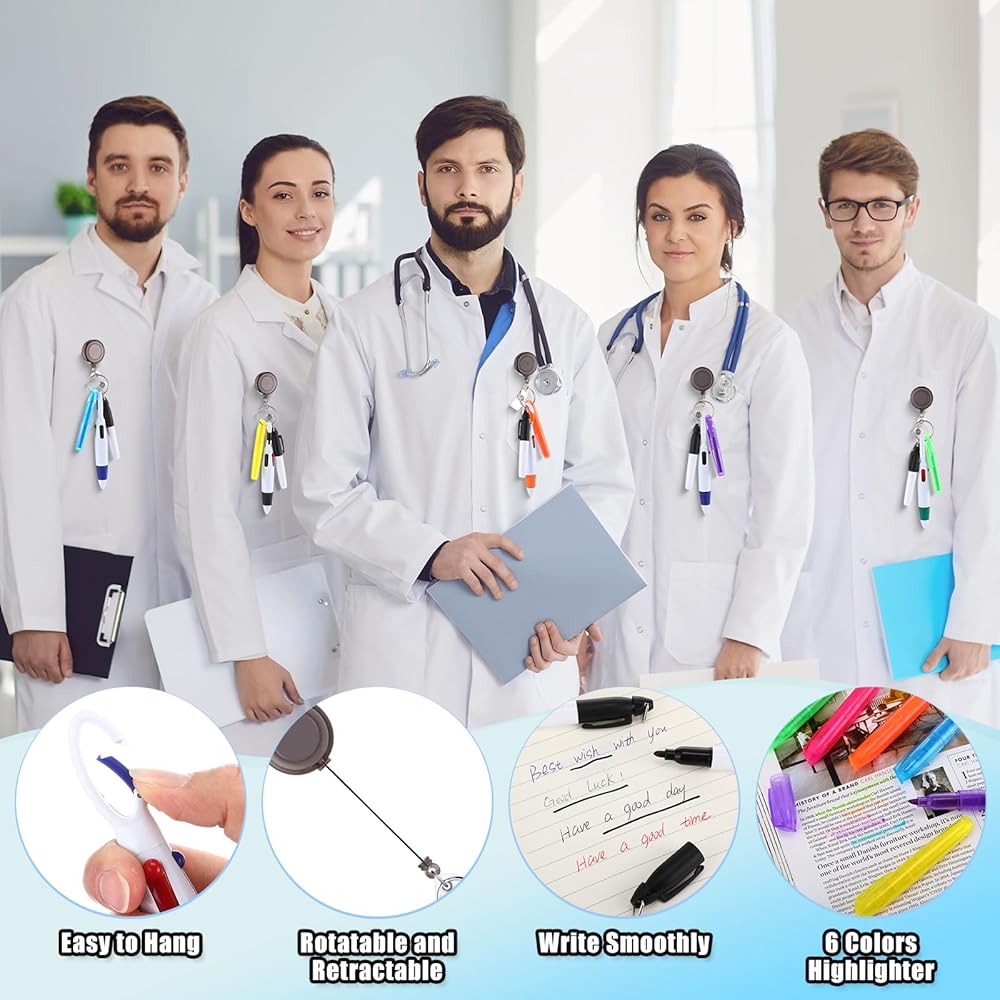 Fulmoon 150 Pcs Nurse Pen Set 30 Retractable Nursing Badge Reel 30 Ballpoint Pens 30 Mini Highlighter 30 Permanent Marker Pen 30 Metal Open Circles for Christmas Gift (Bright Color)