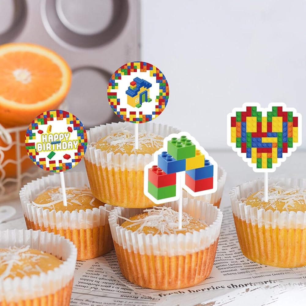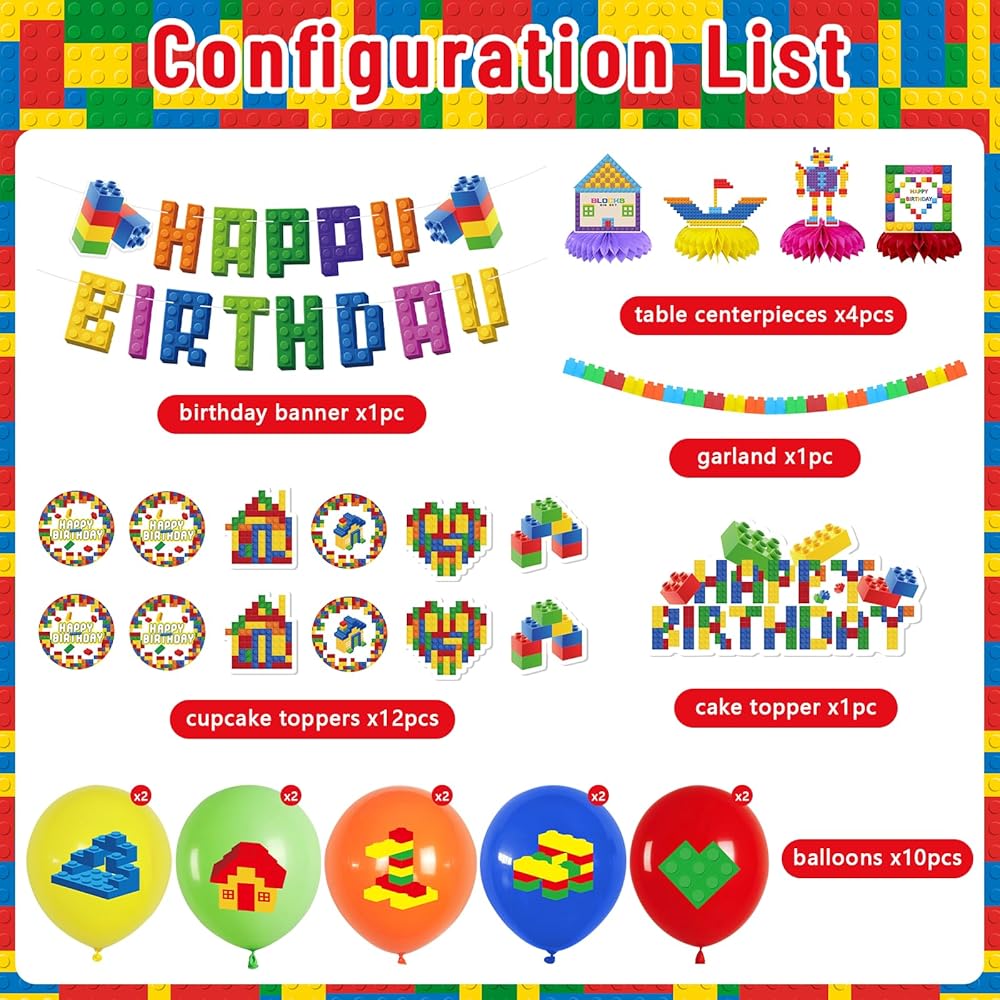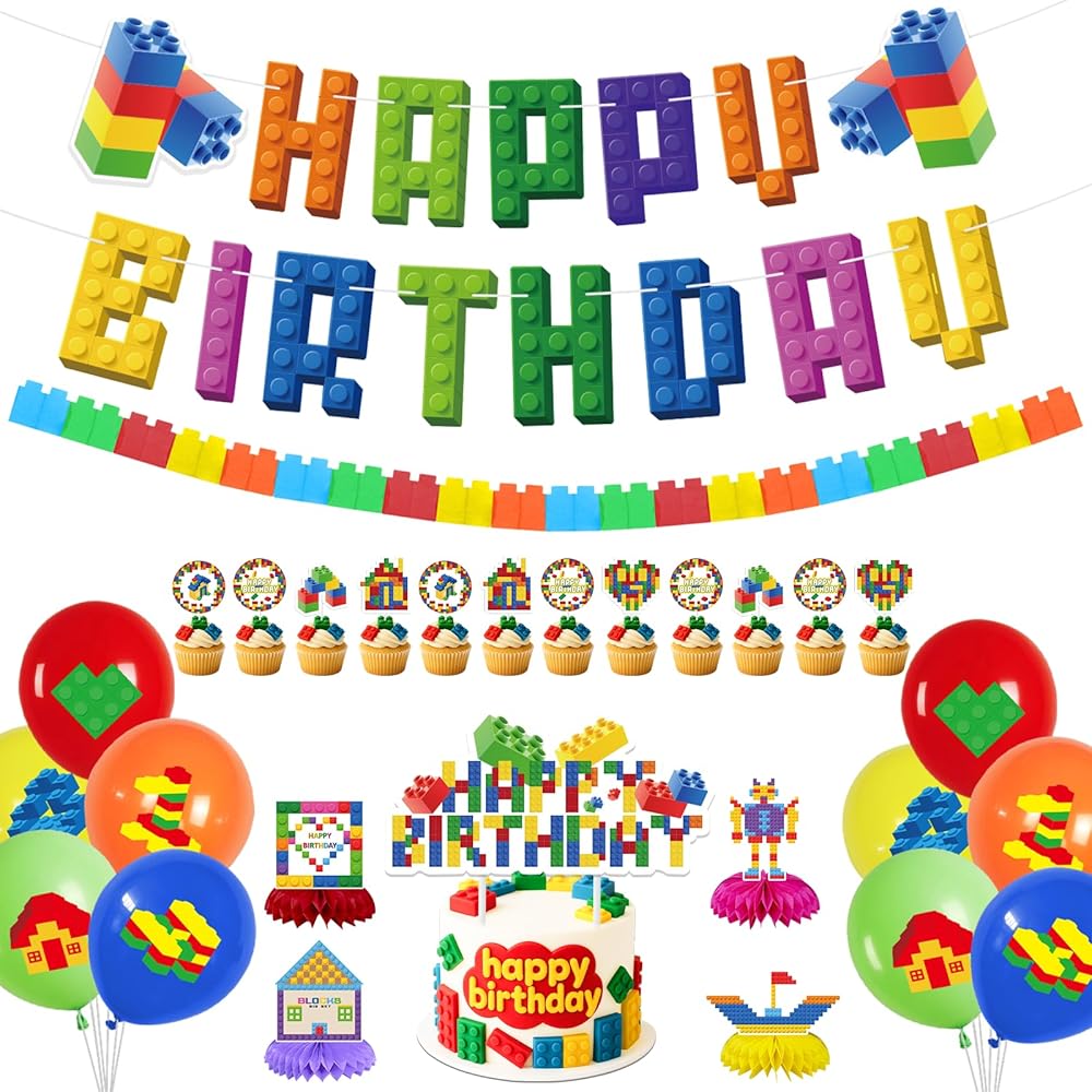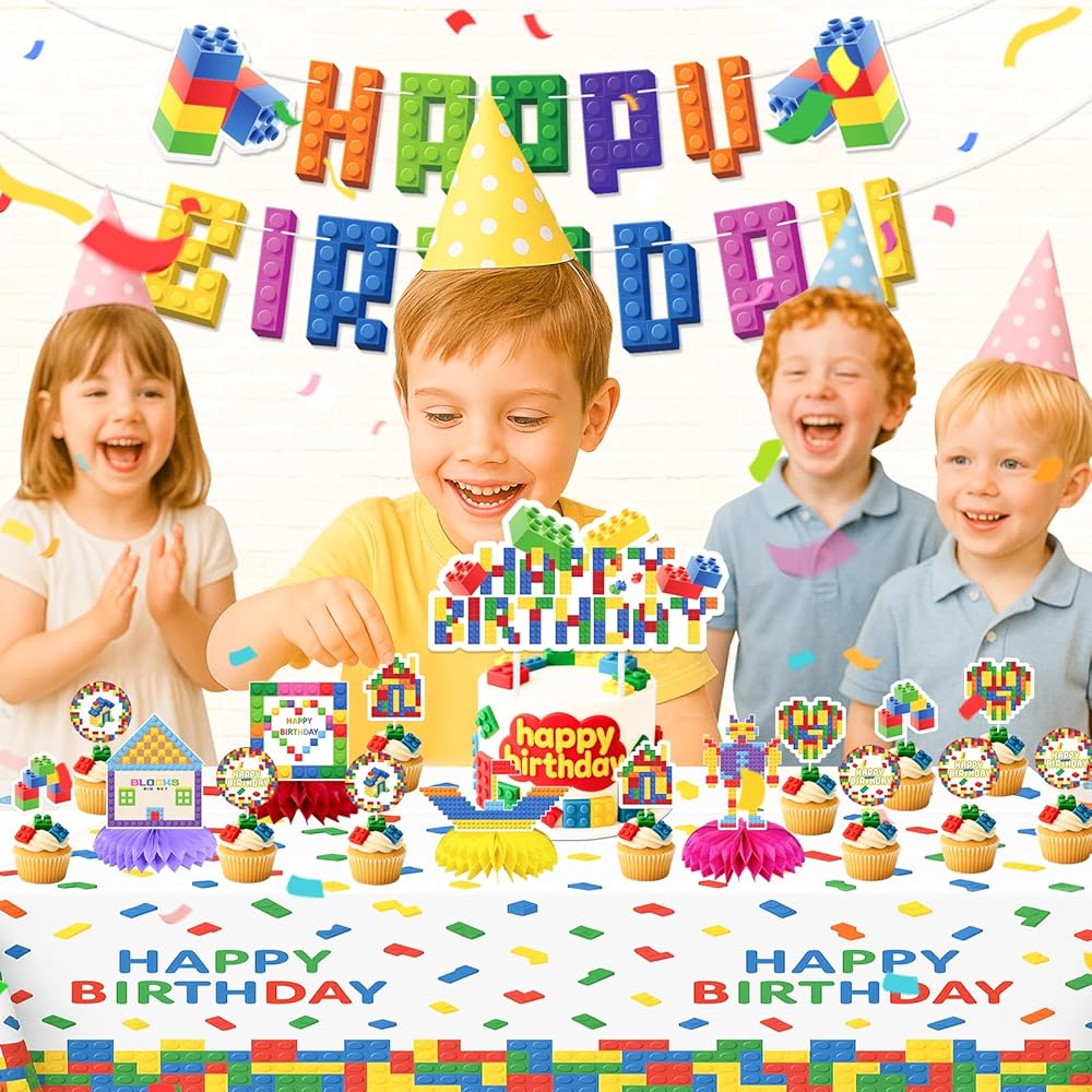 Building Blocks Happy Birthday Decorations - Colorful Brik-Inspired Party Supplies with Banner, Balloons, Cake Toppers, and Honeycomb Centerpieces for Brick-Themed Birthday Decorations