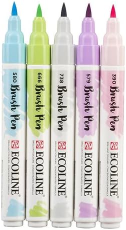 This set of 5 Green Blue Ecoline Liquid Watercolor Brush Pens turns Ecoline's popular paints into easy to use markers perfect for making precise lines, dynamic strokes, or coloring in - wherever you're working. They dry fast and are easy to dilute and blend, even re-wet, with water or the blender pen (sold separately). The set includes Deep Green, Prussian Blue, Bluish Green, Turquose Green and Fir Green.