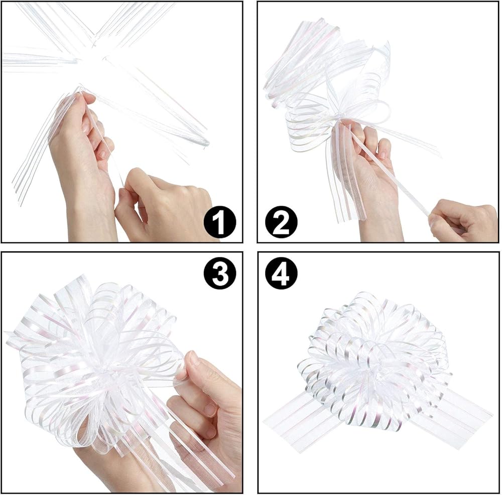 Easy to operate: each pull bow consists of 8 pieces bow parts, which are firmly fixed by plastic rings; just find out 2 thin ribbon, one hand hold the 2 thin ribbon and another hand pull them slowly, a big beautiful bow comes out, you also can follow the steps in the picture/video to get a nice bow