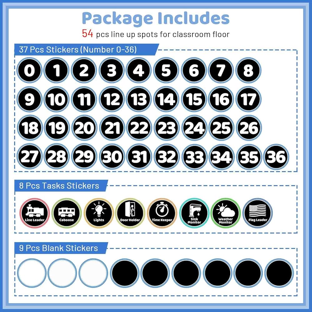 You will receive: A total of 54 colored stickers, including numbers 0 to 36, 8 pattern task dots, and 9 blank stickers. Enough number stickers are used on classroom floor, corridor and storge cabinets to easily indicate queues and the location of items.