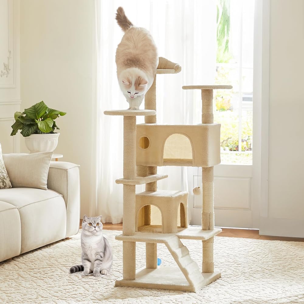 DUMOS 54-inch Indoor Cat Tree Tower –Multi-Level Pet House for Large Cats with 2 Condos, Scratching Posts, Round Platform, Small Ladder, and Toys, Beige