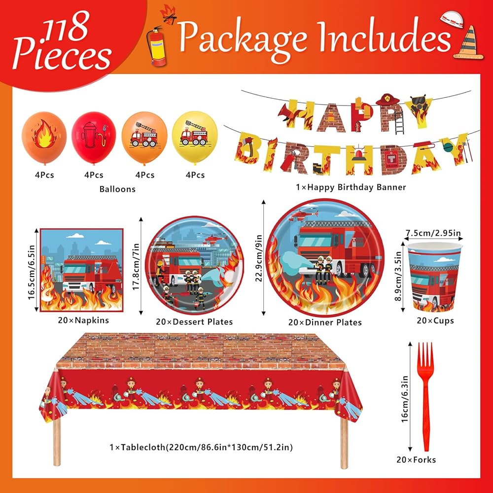 Fire Truck Birthday Party Supplies Serve 20: This firefighter party tableware set that serves 20 people has 118 pieces, including 20 x fire truck dinner plates (9 inch), 20 x fire truck dessert plates (7 inch), 20 x fire truck cups, 20 x fire truck napkins, 20 x forks, 16 x Balloons, 1 x fire truck tablecloth (86.6"x51.2"), 1 x happy birthday banner. Meet all your firetruck birthday party decorations needs in one step.