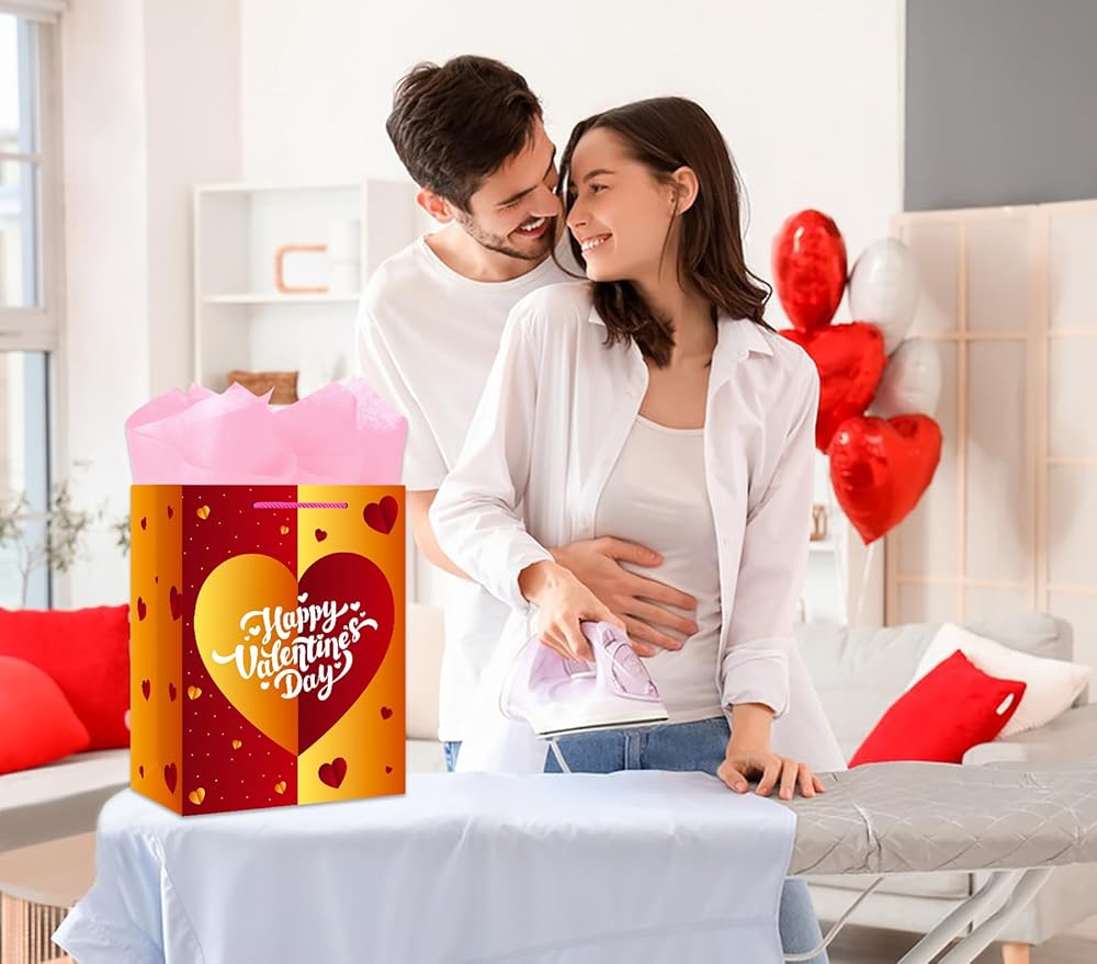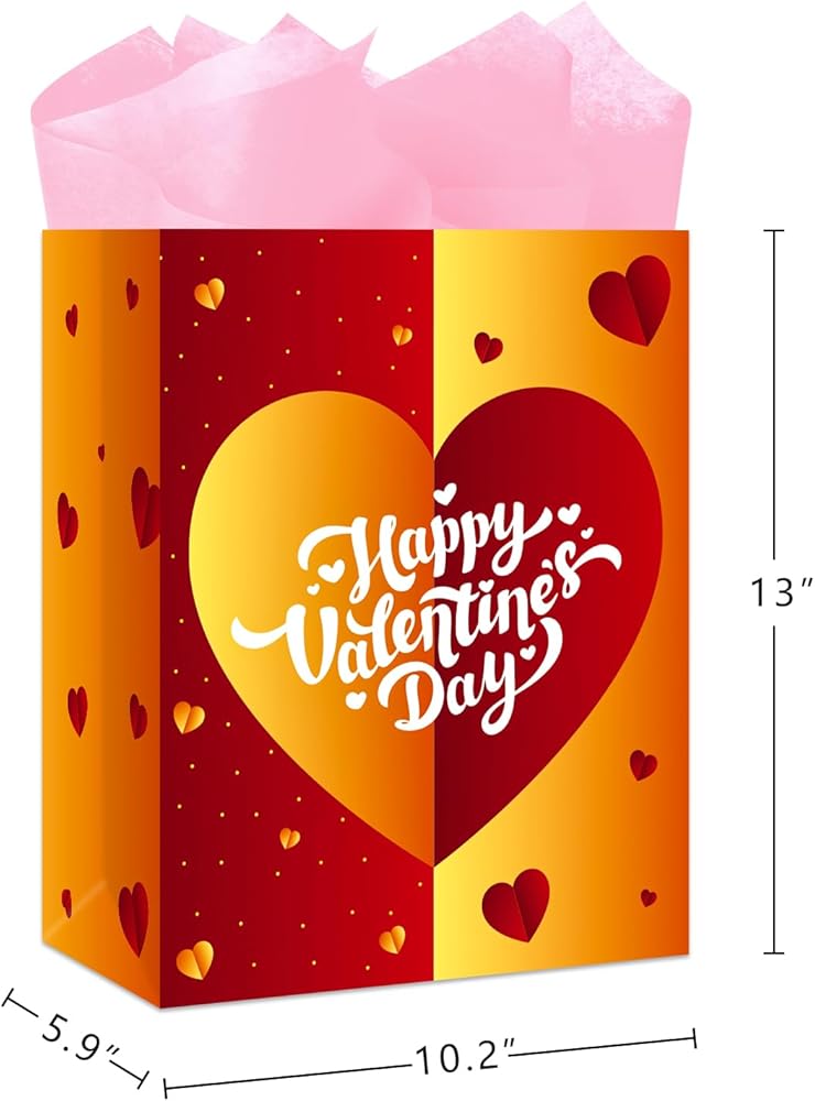 Happy Valentine's Day Gift Bag: Package includes 1 large valentines day paper bag, 2 sheets of pink tissue papers. With handles design,Valentine's Day paper bags are perfect for craft and DIY, you can decorate it with beautiful ribbons, especially for Valentine's day party decorations