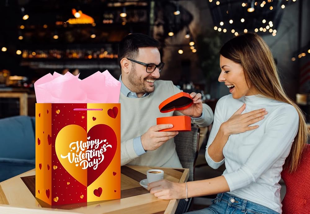 JUESMOS 13" Valentines Day Gift Bag with Tissue Papers Happy Valentines Day Gift Bag with Handles Love Heart Paper Goodies Treat Bag for Valentine's Day Gift Bags for Girlfriend Boyfriend Wife Husband