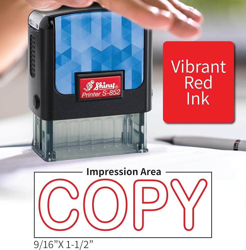 Shiny Copy Stamp Self Inking Rubber Stamp, 1/2" by 1-1/2" Impression Area, Red Ink, Refillable Built-In Stamp Pad: Shiny self-inking rubber stamps offer a built-in stamp pad that can provide thousands of fast repetitive impressions before re-inking is needed Easy Pad Release: The push-button pad release ensures re-inking your stamper is a breeze; simply apply the side lock buttons and push the red button to release the stamp pad Supreme Ink: Shiny Supreme water-based red ink creates vibrant impressions; the stamp pad can easily be re-inked which is a cost-effective way to extend the life of your stamper Office Stamps: Shiny S-852 business supplies feature a clear base and slip-resistant rubber feet making them ideal for many applications including booking keep, ordering, teacher stamps and more Mechanically Tested: While you will need to re-ink your self-inking stamp, rest assured that the mechanical components have been tested to achieve over 1-million impressions