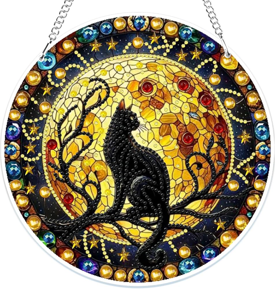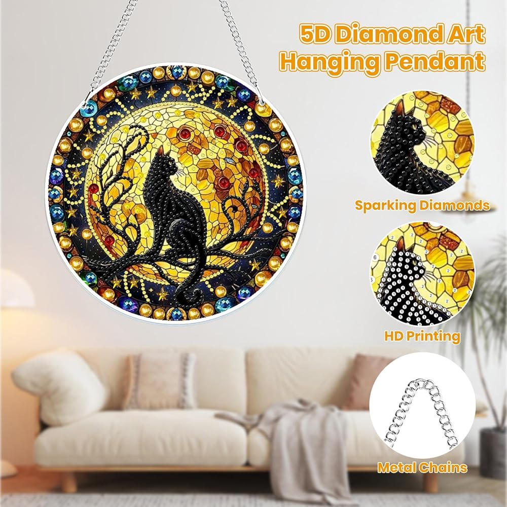 MOGTAA Hanging Diamond Art Painting Pendant Kits, 5D Black Cat Diamond Art Kits for Adults, DIY Animal Diamond Painting Kits Special Crystal Gem Art for Home Decor