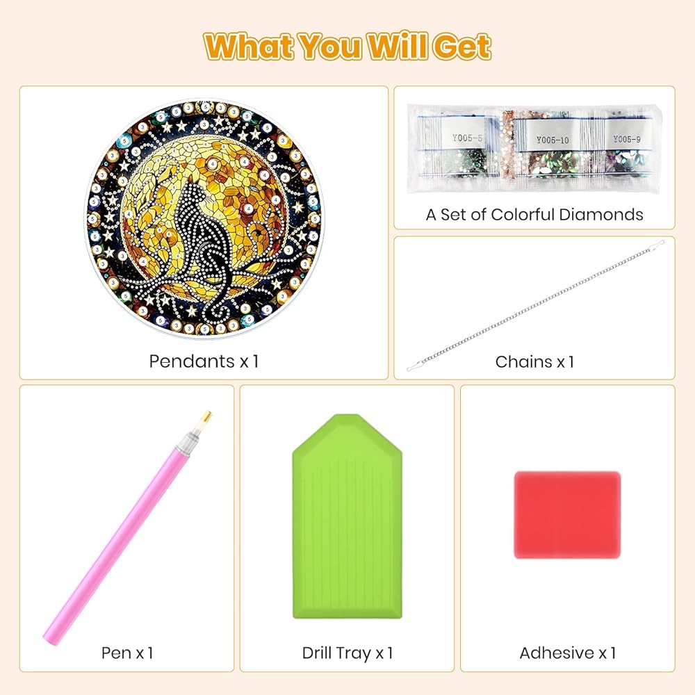 What You Will Get: Package kits includes diamond hanging plate x1, iron chain x1, point diamond pen x1, cube diamond tray x1, red glue clay x1 , enough special shape diamonds, with beautifully crafted boxes