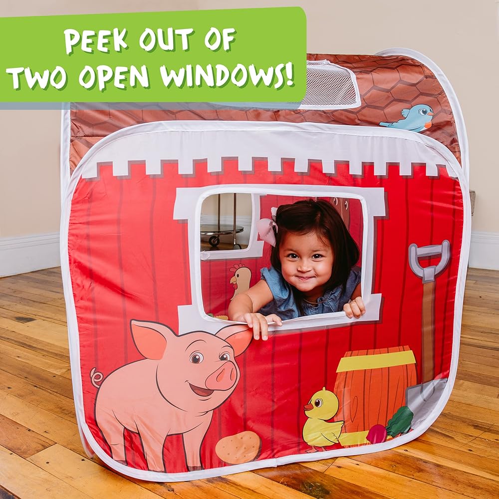 Join JJ and friends on the farm with the Old MacDonald's Musical Barn Pop Up Tent! This adorable playhouse is inspired by the nursery rhymes from the educational YouTube series, CoComelon! Press on the iconic logo music box and sing along to the full version of "Old Macdonald Had a Farm”. With bright, engaging colors and realistic character graphics, kids' imaginations will come alive as they pretend and play. Children can crawl onto into the barn through the roll up entrance door, once inside they can peek out of the two open windows. Parents will love the simple pop up design for hassle free assembly, easy storage and on-the-go fun. No need for tools!