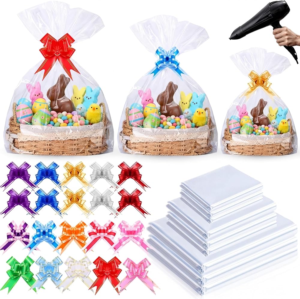 Our shrink wrap gift bags are designed in 3 different sizes, with pull bows of different colors and sizes. They can be used for packaging gifts and gift baskets. Different sizes and colors are eye-catching and make your items more beautiful and exquisite.