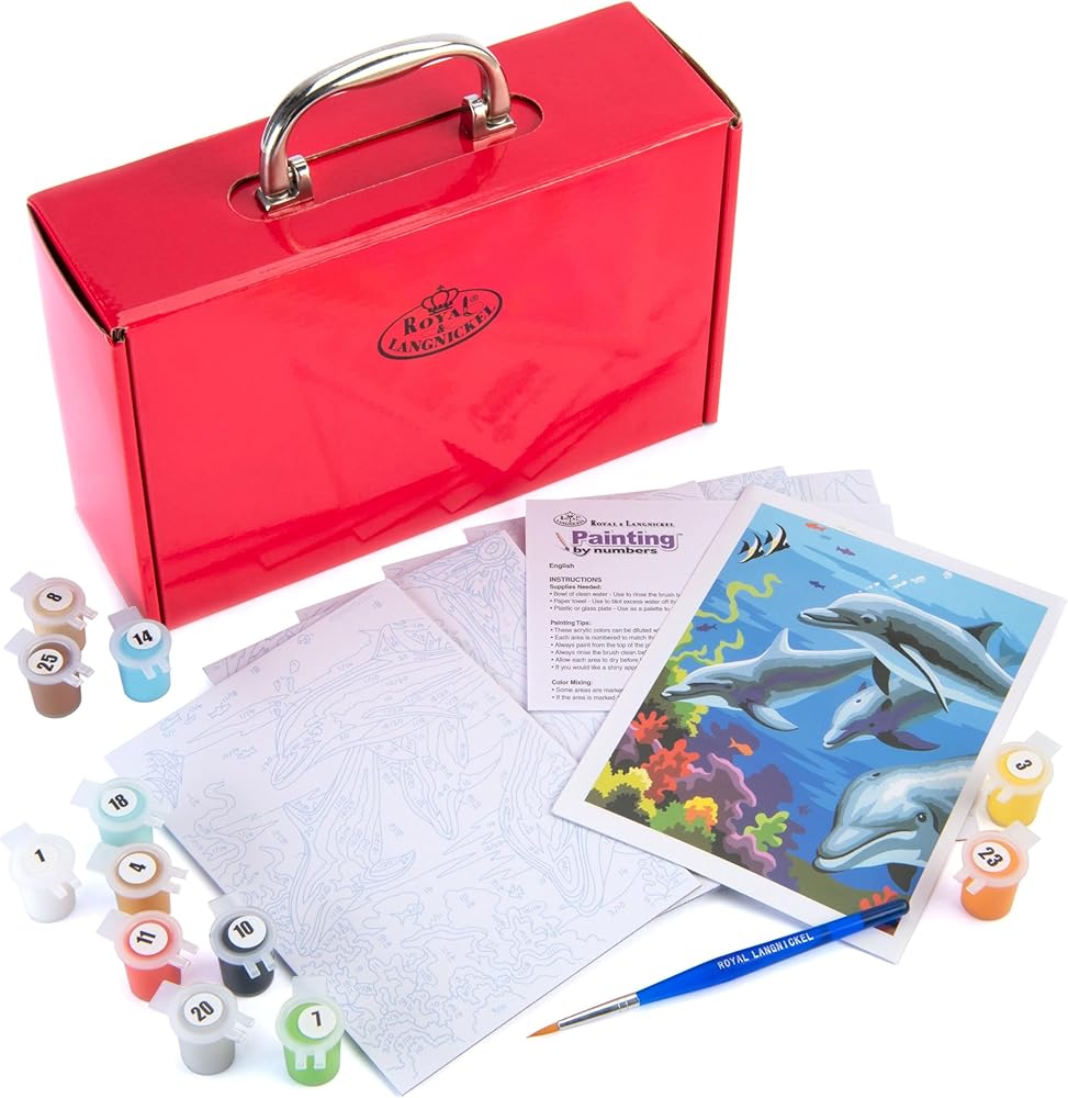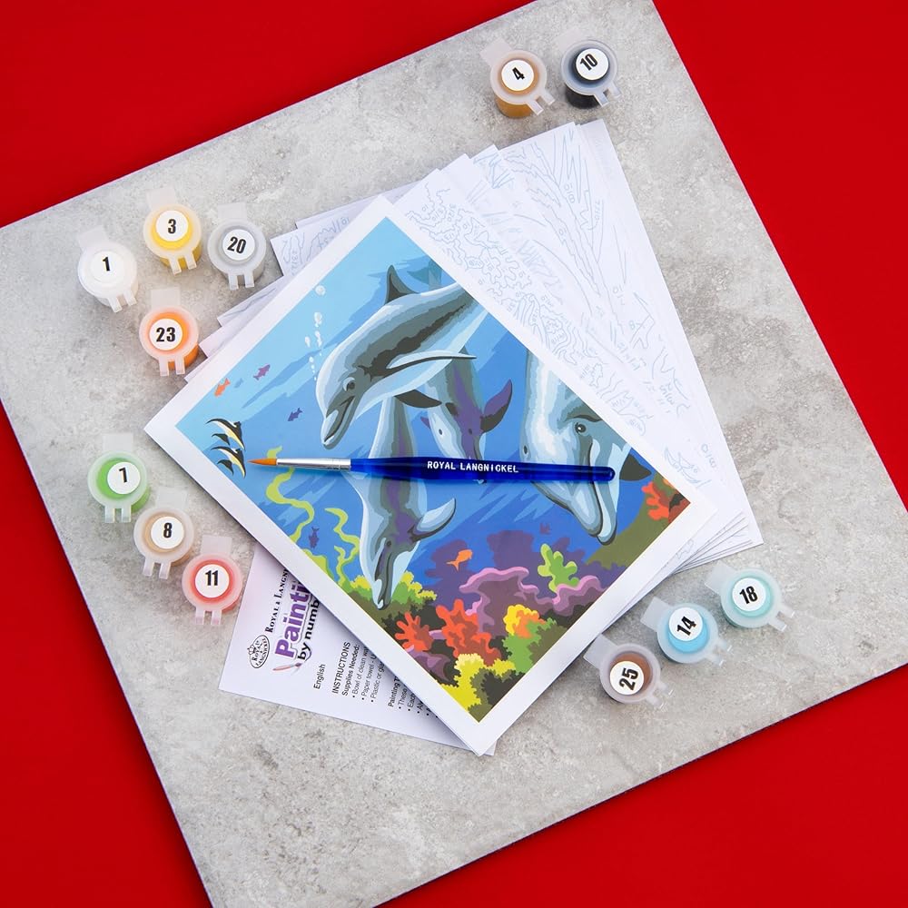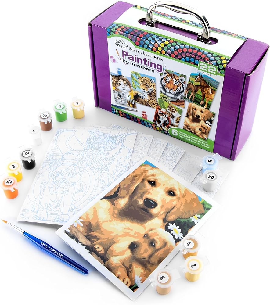 Royal brush-painting by numbers kit. The ideal set for starting all your paint by number projects! this 6-1/4x9-3/4x3 inch package contains twelve 3ml paint pots one paintbrush six pre-printed Boards three double-sided final artworks and instructions. Conforms to ASTM d 4236. Imported.