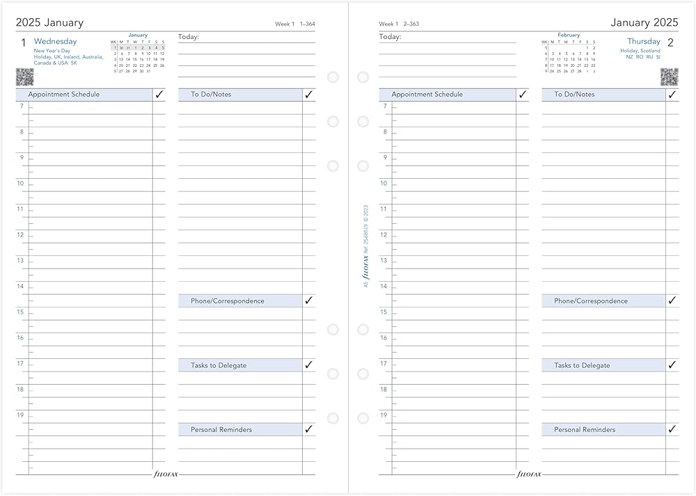 This Filofax A5 2025 diary refill features a QR code on every day which, when used together with the Filofax Reminder App, allows you to plan on paper and review on your phone. Simply download the free Filofax Reminder app and scan the QR code on the date of your choice. This will allow you to not only copy appointments from your diary onto the App, but also set up reminders. The appointments can also be synced with your phone's calendar. This innovation will allow you to always have the important contents of your diary with you. This Filofax A5 2025 diary is a week on two pages column format in English, with the week to view starting on a Monday. The year runs from January to December 2025. 80 gsm fountain pen friendly white paper. Paper size 148mm x 210mm, drilled with six round holes.