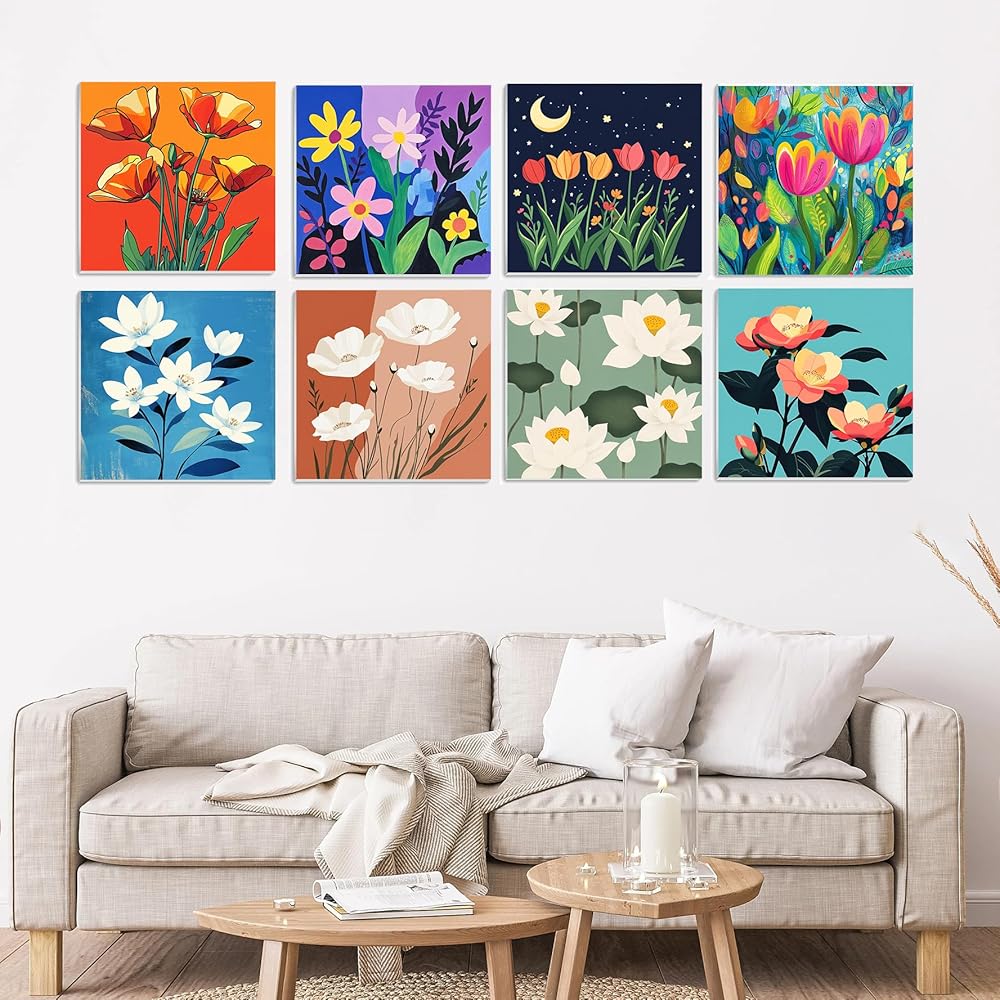 SKRYUIE 8 Pack Art Boards Set Paint by Numbers Kits for Adults Flower, Acrylic Mountain Oil Painting pre Drawn Canvas for Painting for Beginner with Brushes for Home Decor 7.87x7.87 inch / 20x20