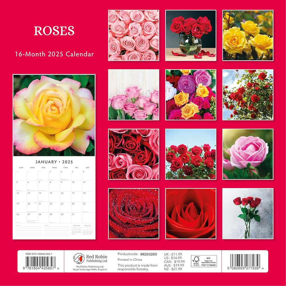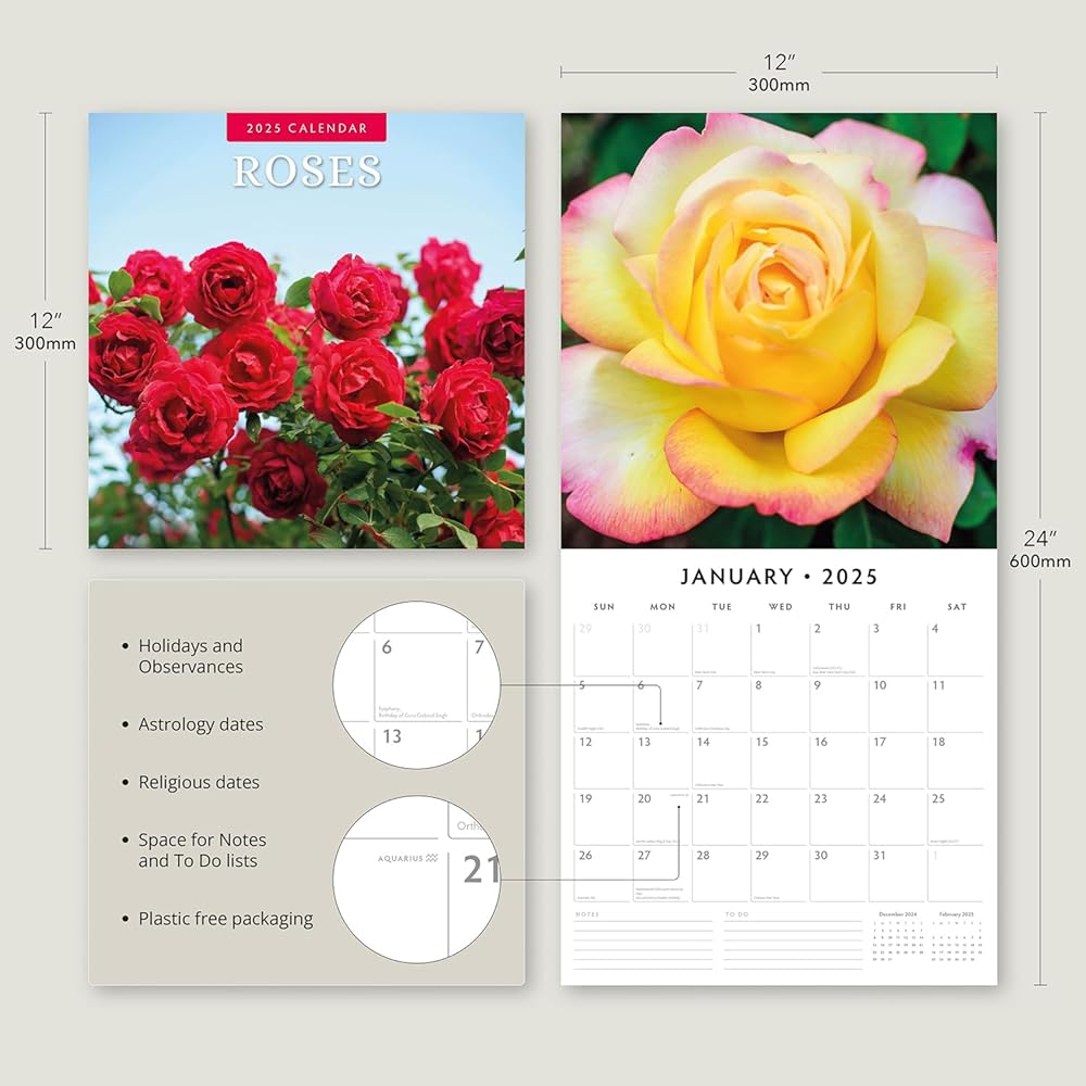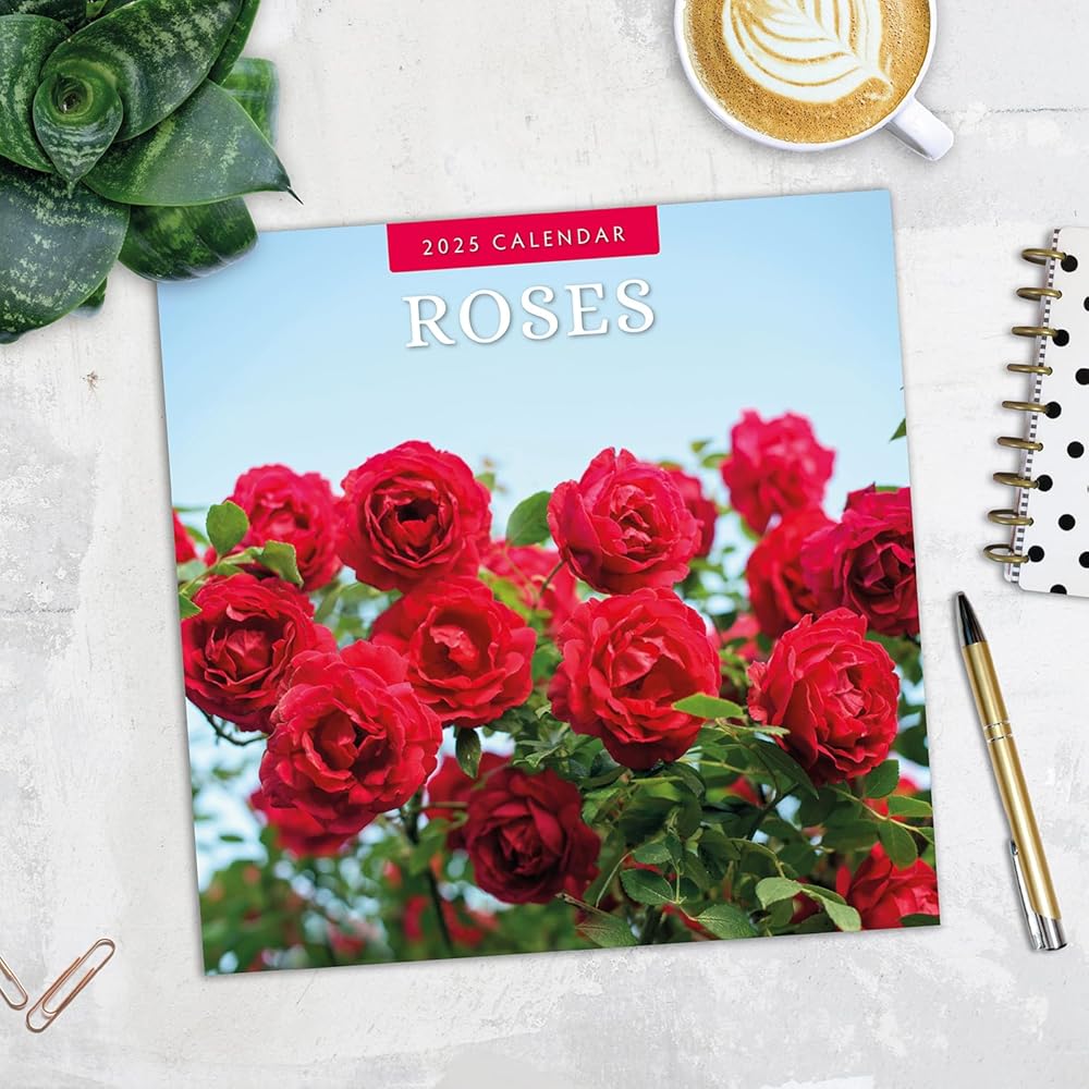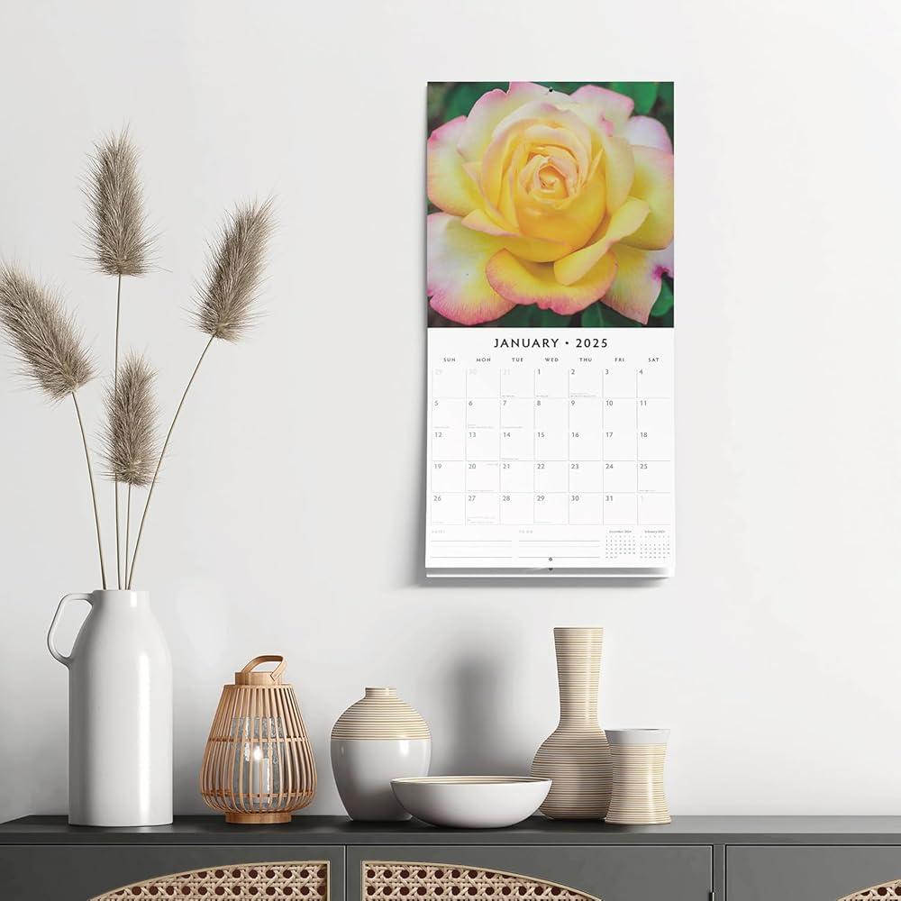 Indulge in the timeless beauty of Roses with the 2025 'Roses' wall calendar. Sized at 12" x 24" open and printed on premium thick & sturdy paper, this calendar showcases the elegance of one of the world's most beloved flowers. From classic red roses symbolizing love to delicate pink and white varieties, each month offers a stunning photograph of different rose species in full bloom. Whether you're a gardener, flower enthusiast, or simply love the grace and fragrance of roses, this calendar is a perfect way to bring their beauty into your home year-round.