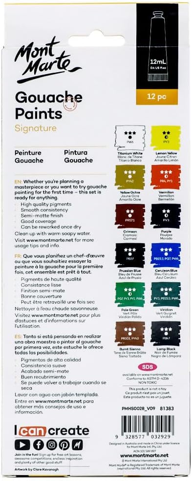 Mont Marte Signature Gouache Paint, 12 x 0.4oz (12ml), Semi-Matte Finish, 12 Colors, Suitable for use with Canvas, Watercolor Paper, Watercolor Paints and Mixed Media