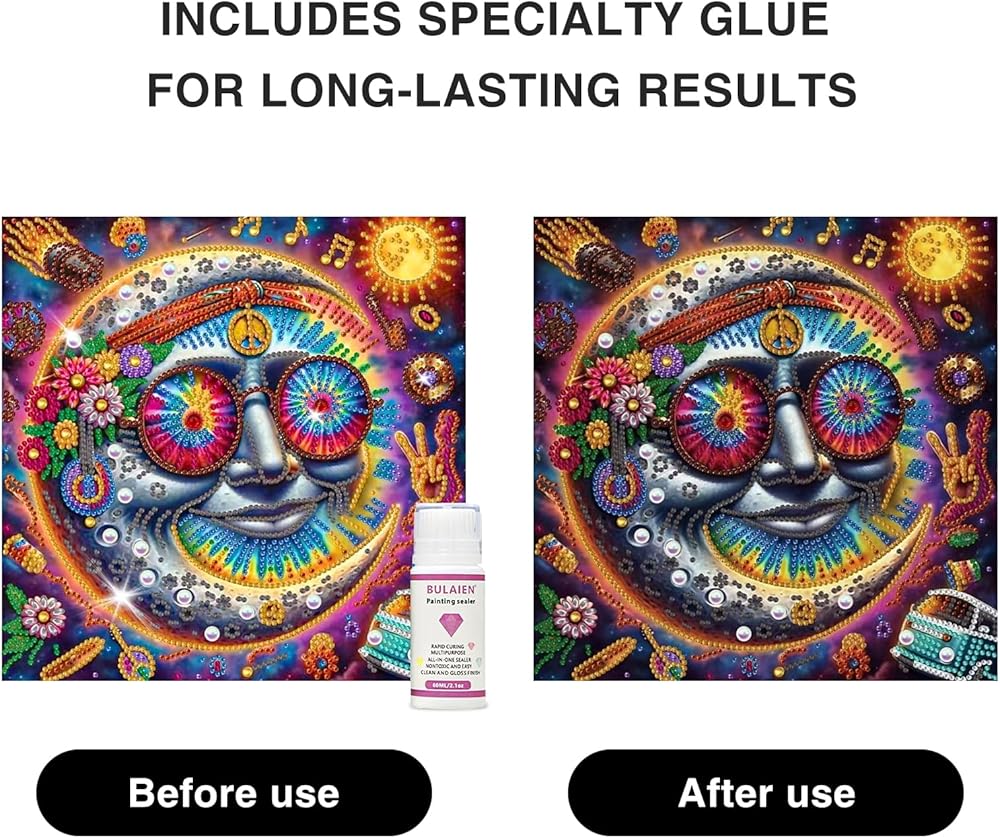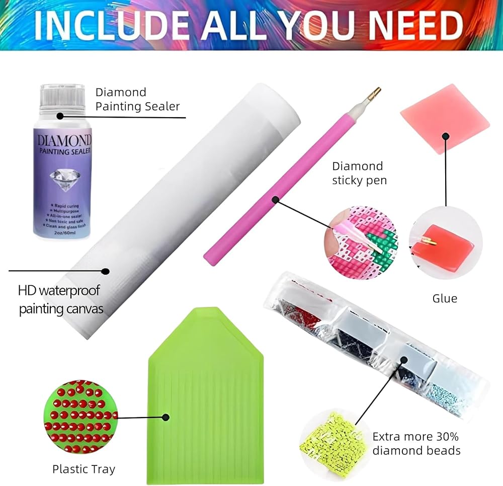 Diamond Art Kits :Each kits contains all adult diamond painting kits . Including 1× high definition painting canvas ; color coded rhinestones ; 1× Diamond Painting Sealer ;1× Diamond Painting pen ; 1× craft diamond painting trays ; 1× clay ; 5× self-sealing bags. Note: The frame is not included. Don't worry about the lack of diamonds . Add 30% percent to each color of rhinestone diamond