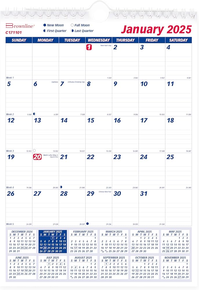 Plan in advance with the Brownline® Monthly Wall Calendar spanning 12 months, January to December 2025. One month per sheet format and one lightly ruled block per day layout (Sunday-Saturday). Twin-wire binding construction with eyelet hanger to easily suspend and display on wall. Full-year reference calendar on the bottom of each sheet for long-term planning. Features: numbered weeks, countdown of days passed and days to come (Julian dates), highlights holidays and phases of the moon. Reinforced chipboard backer provides a sturdy writing surface. English. Size: 8" x 11". Brownline® Dated Products are produced using acid-free paper to prevent color-change over time and vegetable oil-based inks to help protect the environment.