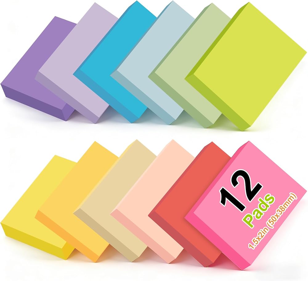 PORTABLE SIZE - Each pack contains 1.5 x 2 inches, 12 pads/pack, 100 sheets/pad, Total 1200 sheets.Small Sticky notes Use for school, office, family. great for leave reminders or call out important information posted on wall, blackboard, computer, desktop, refrigerator, book, document, and other smooth surface