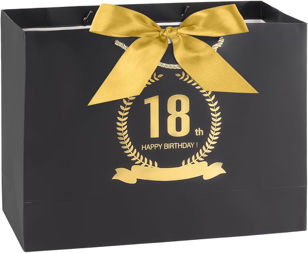 FUNCANDLE Black Gold Happy 18th Birthday Gift Bag with Greeting Handles and Ribbon Decorations Girls Boys 18 Year Old Birthday Gift Wrapping Bag for Party Favors Elegant Supplies