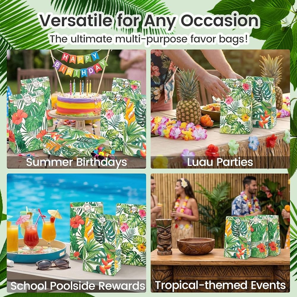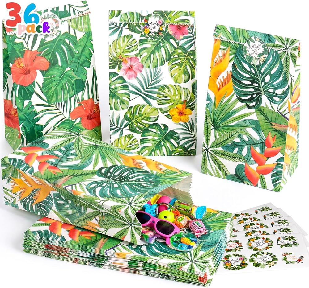 VGOODALL 36 Pcs Tropical Hawaii Party Favor Bags with Stickers - 8.7"x4.7"x3.1" Luau Aloha Goodie Bags, Summer Beach Theme for Kids Birthday, Party & Gift Packaging (3 Designs)