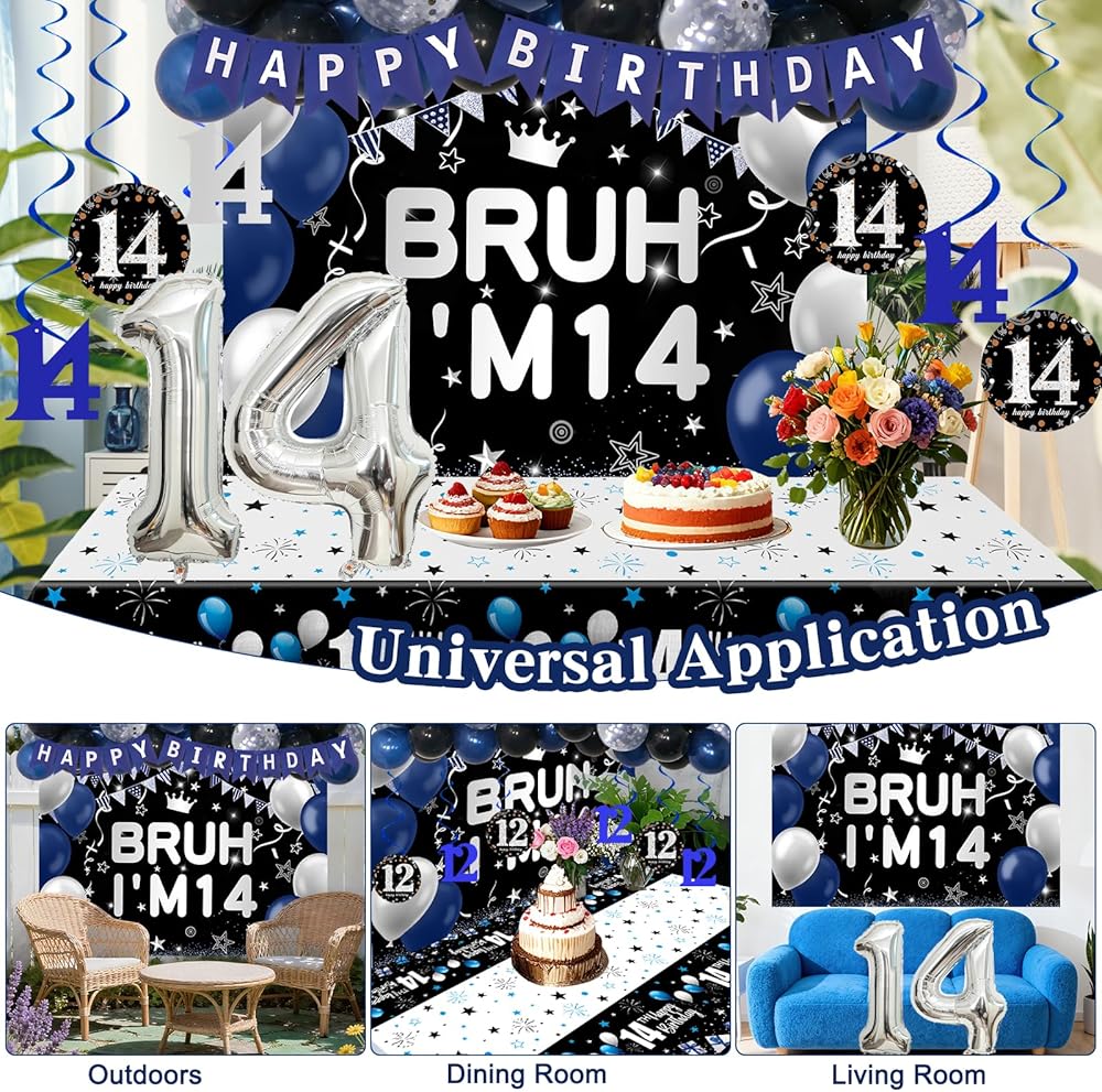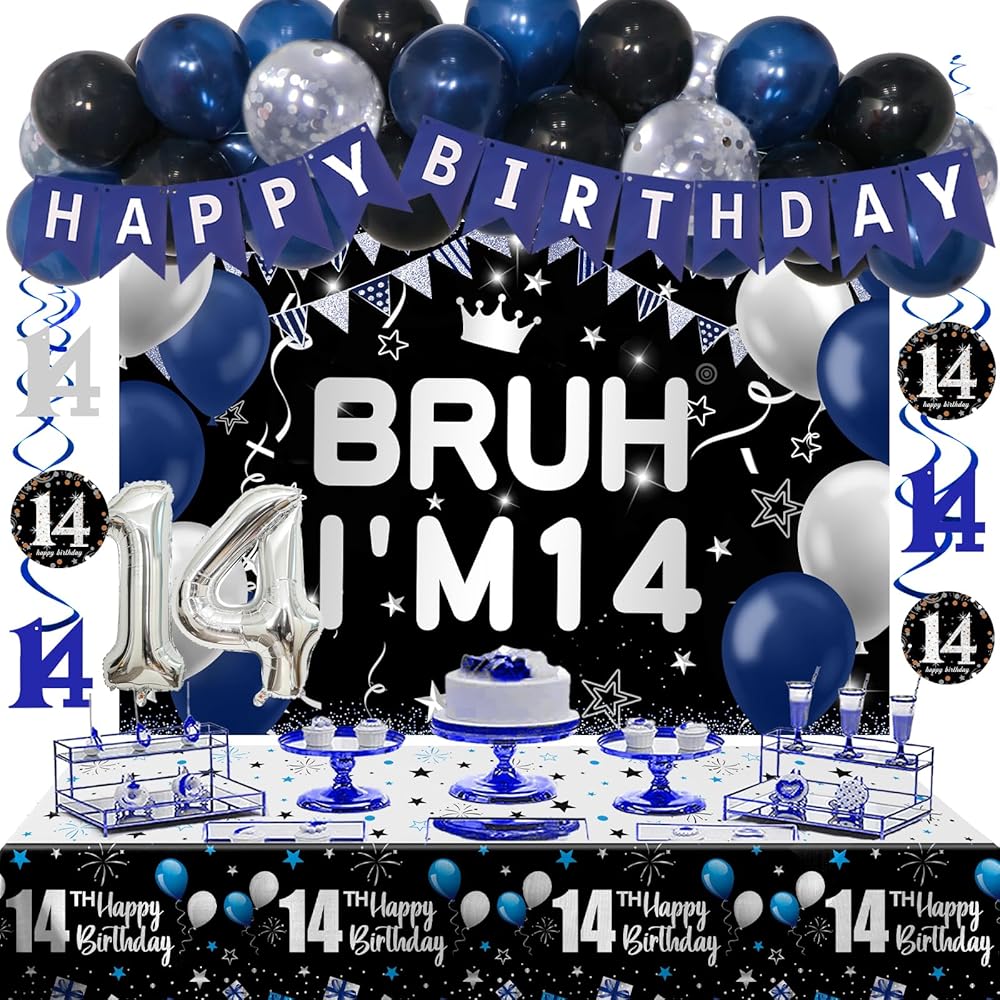 14th Birthday Decorations for Boys Girls, 54 PCS Blue Black Party Decor, 14 Year Old Boy Birthday Party Supplie with Banner Backdrop, Hanging Swirls, Tablecloth, Bruh Its My Birthday Decorations