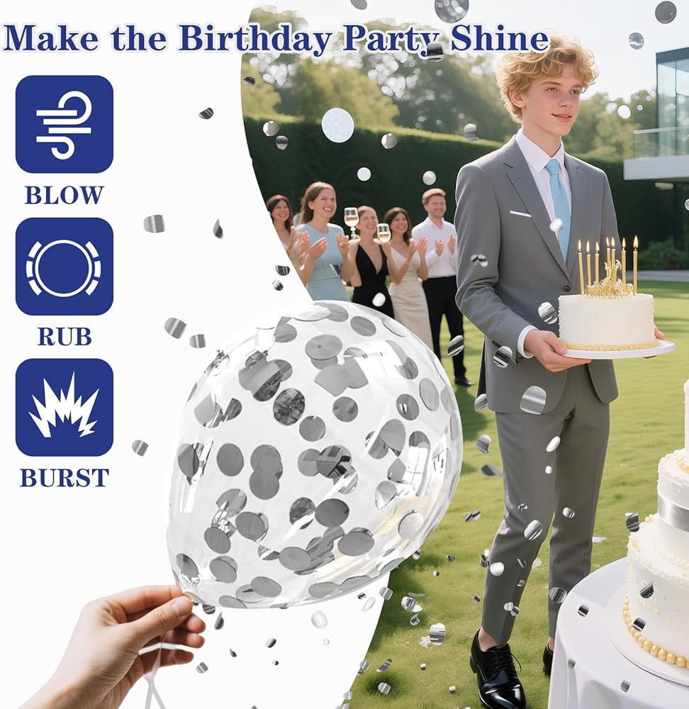 Sweet 16 Party Decorations Package List - Blue 16th birthday decorations set includes 20 dark blue balloons, 15 silver balloons, 5 white balloons, 10 silver confetti balloons, 2 silver star balloons, 1 blue star balloons, 1 blue silver 16th birthday background cloth, 1 blue silver 16th birthday tablecloth, 2 silver fringe backdrops, 1 roll of Sticker dot/ ribbon/ balloon strip. Our blue 16th birthday decorations for boys girls are unforgettable and satisfying, creating a dreamy and magical atmosphere for the celebration