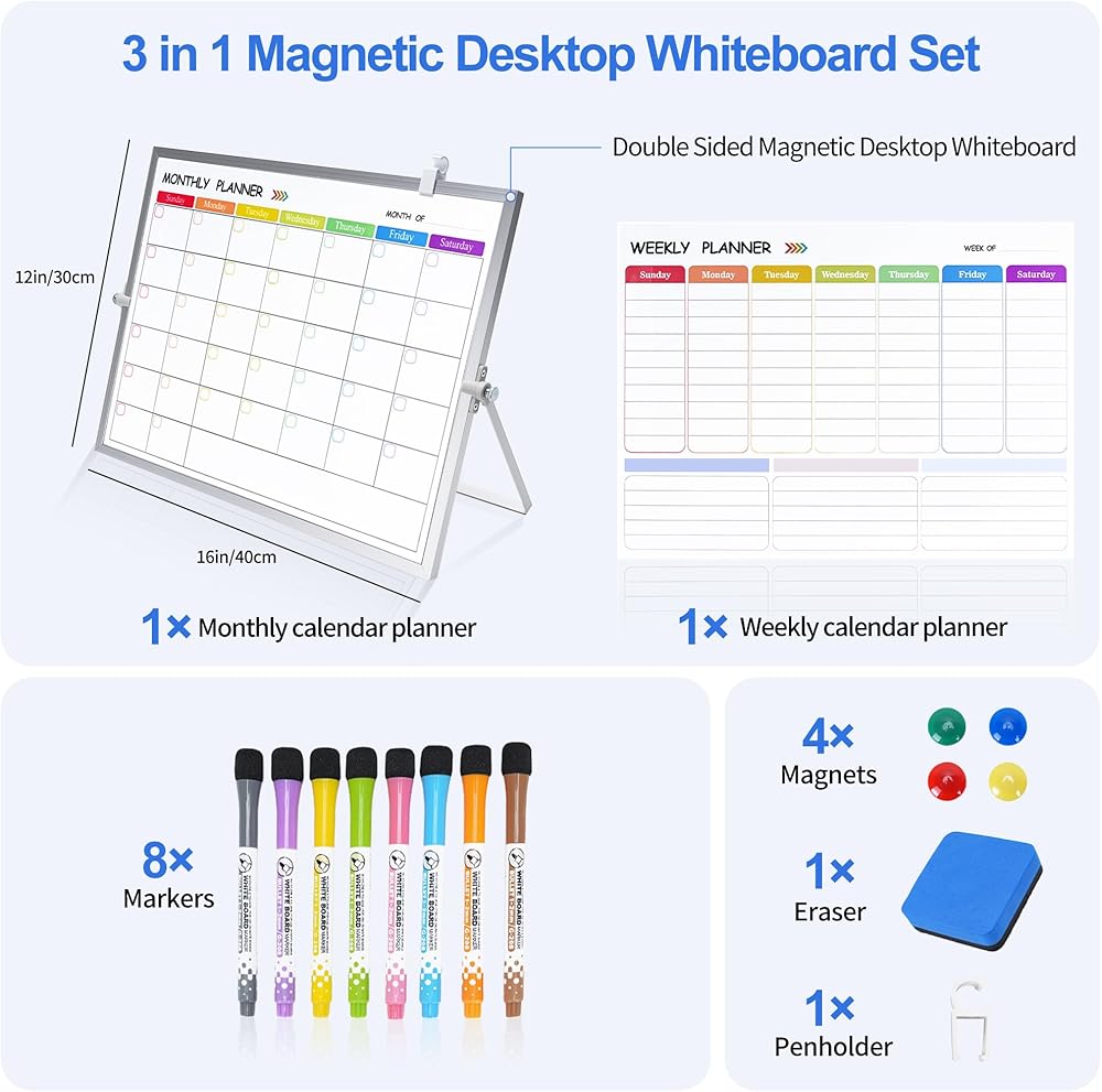 3 in 1 Colorful Magnetic Dry Erase Weekly Planner&Monthly Calendar& 16"x12" Double Sided Magnetic Desktop Whiteboard with Stand,8 Markers, 4 Magnets, 1 Eraser for Office,School,Home