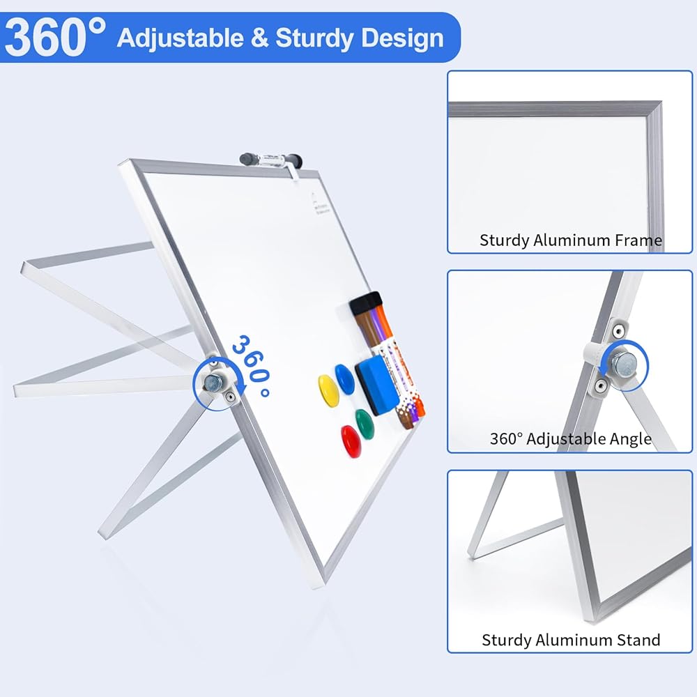 Adjustable Angle Dry Erase Whiteboard with Stand:This magnetic desktop whiteboard size is 12''x16''. The 360° adjustable knob allows you to adjust the placement angle you want. You can place it the way you like, which is convenient for you to write and hold