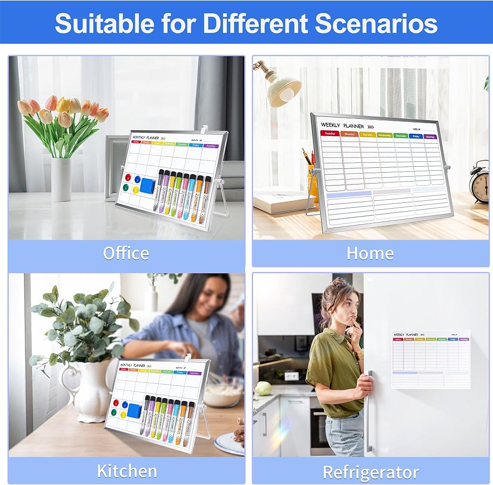 Multi-Function Magnetic Planner Set: This set includes 1 double-sided stand board + 2 dry erase soft magnetic planners - (1 weekly calendar planner, 1 monthly calendar planner). You can use the double-sided whiteboard alone, or you can stick the weekly calendar planner and monthly calendar planner soft magnetic stickers on the whiteboard for weekly and monthly calendar planning, providing you with a variety of planning options