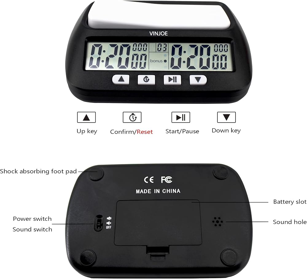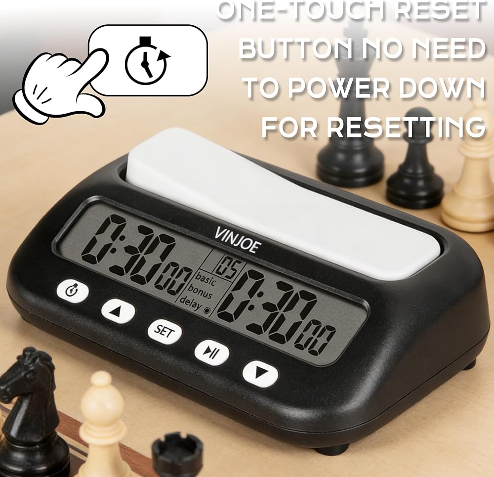 • ♟️【Four functions】♟️ VINJOE digital chess clock has four functions, Basic, Bonus, Delay and Positive Time Features. This portable chess clock can meet the timing functions required for most two-player board games, and four different timing functions add a lot of fun to the game. There is also a most special function, that is, you can return to the initial setting timing rules with one key, avoiding the trouble of restarting or pressing it several times