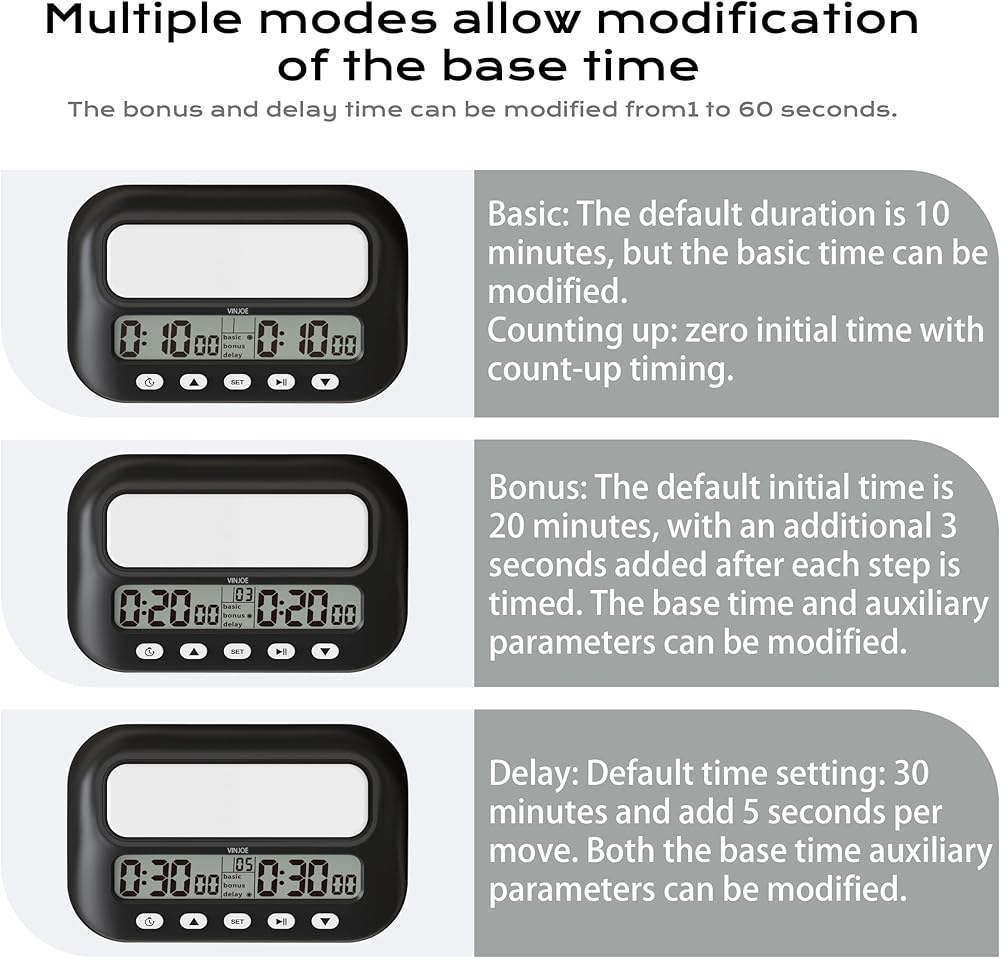 • ♟️【Simple set up and controIs 】♟️This chess timer professional for Board Games is very easy to operate. Even new players can quickly learn to use it. We provide a very detailed instruction manual, concise and to the point. We have also uploaded a video on the product details page to give a more intuitive understanding of how to use this chess clock timer