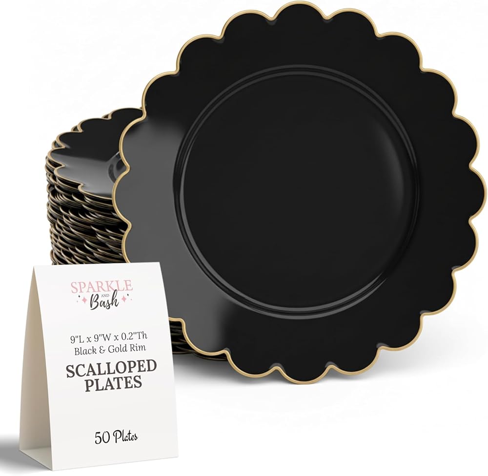 Sparkle and Bash Black Scalloped Plastic Plates with Gold Rim 9 Inch, 50 Pack – Elegant Disposable Dinner Plates for Weddings, Parties, Birthdays, and Special Events – Heavy Duty, Stylish Tableware