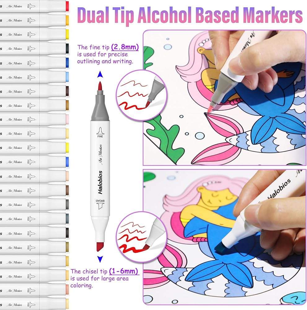 ✐DUAL TIP ALCOHOL MARKER: The fine tip markers have a fine nib on one end for fine work or fine lines, and a broader chisel tip on the other end for filling in larger areas or creating thicker strokes. This dual tip design allows you to switch between a fine and broad tip for a variety of drawing and writing needs without having to change tips.