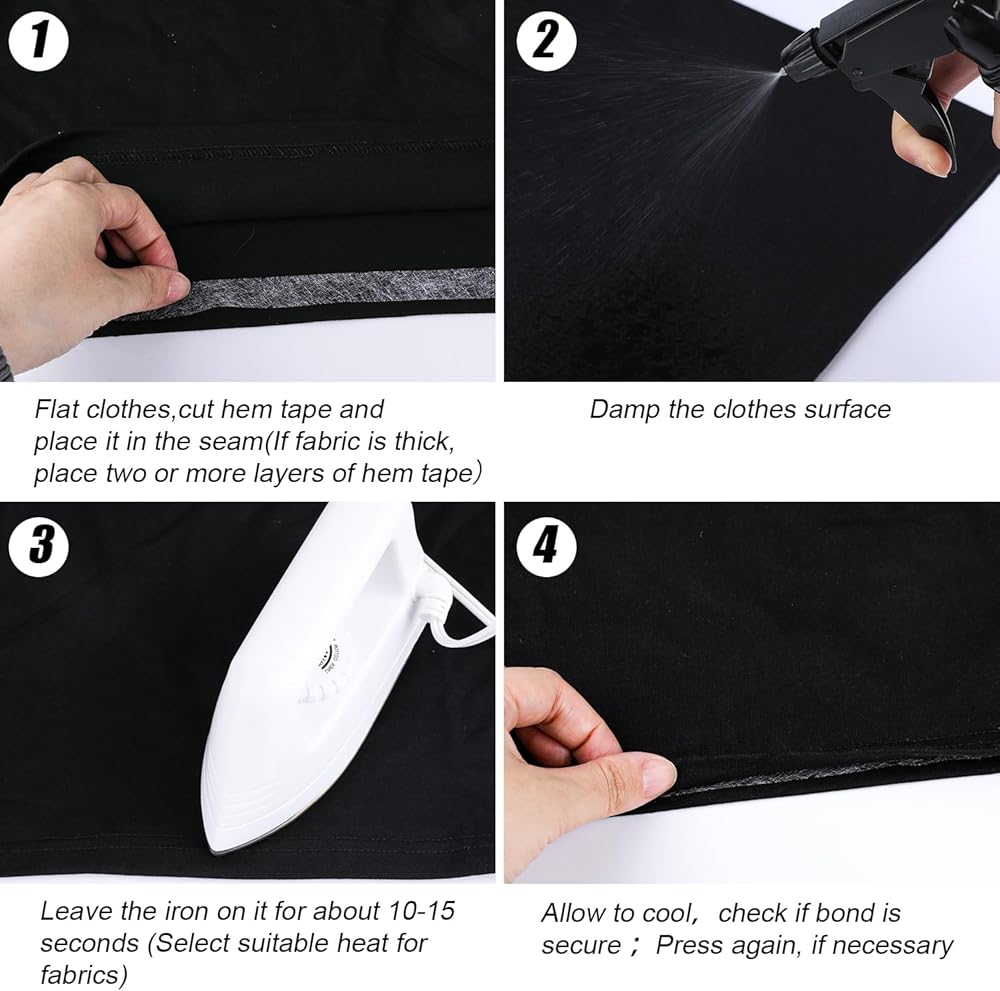 Easy to Use: Flat the clothes, cut a piece hem tape and place it in the seam,and damp the clothes surface, then iron back and forth for about 10-15 seconds(Select suitable heat for fabrics),until the entire surface is bonded. Note: 150 degree Celsius high temperature is required to make the fabric adhesive sticky